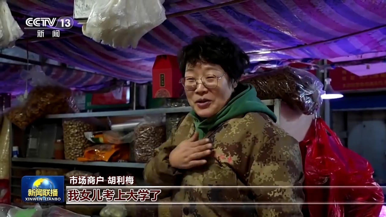 市场商户 胡利梅:过春节不就是为了天天在外面的家人回来团聚嘛,大家聚在一起,总归要开开心心聊聊天,瓜子花生总归要有是不是。最开心的事情是我女儿考上大学了,考的好大学,“双一流”的!