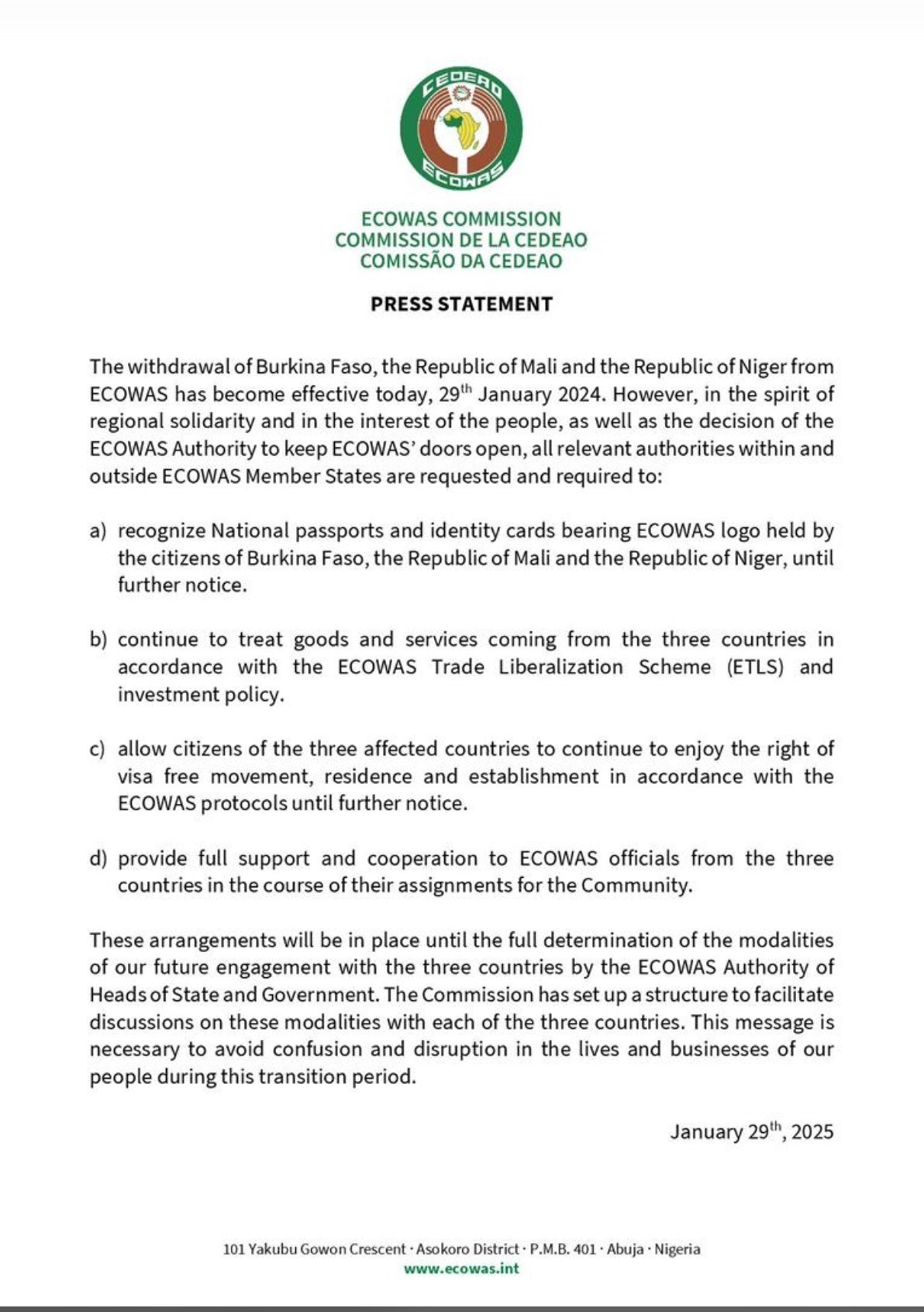 西非国家经济共同体2025年1月29日发布的声明