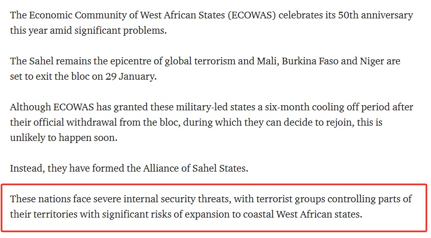 然而,分析人士认为,三国重返西共体的可能性并不大。而三国还面临严峻的内部安全威胁,可能会导致恐怖主义泛滥至该地区其他国家。