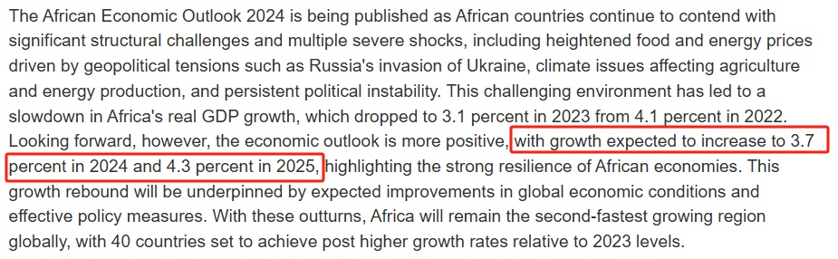 非洲开发银行最近更新的《非洲大陆宏观经济表现和展望》预测,非洲大陆2024年实际国内生产总值(GDP)平均增长率为3.7%,预计2025年将升至4.3%,超过世界平均水平。