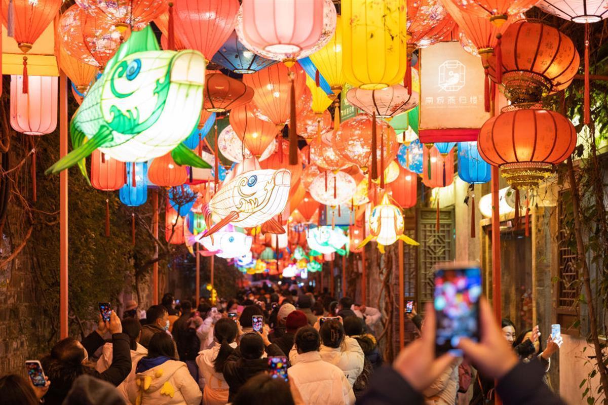 游客在南京老门东景区赏灯游览(图源:央视新闻)