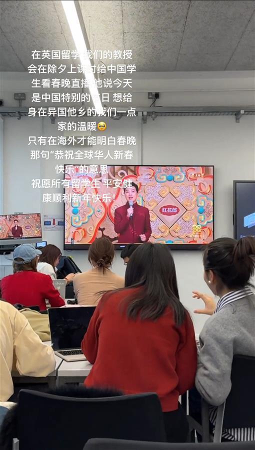 1月28日晚,央视春节联欢晚会如约而至,无数海内外的中华儿女共同欢度新年。正在英国伦敦留学的中国学生“Sana”(网名)接受极目新闻记者采访时表示,她们的英国教授在课堂上为学生们放了春晚的直播,“想给身在异国他乡的中国学生一点家的温暖”。