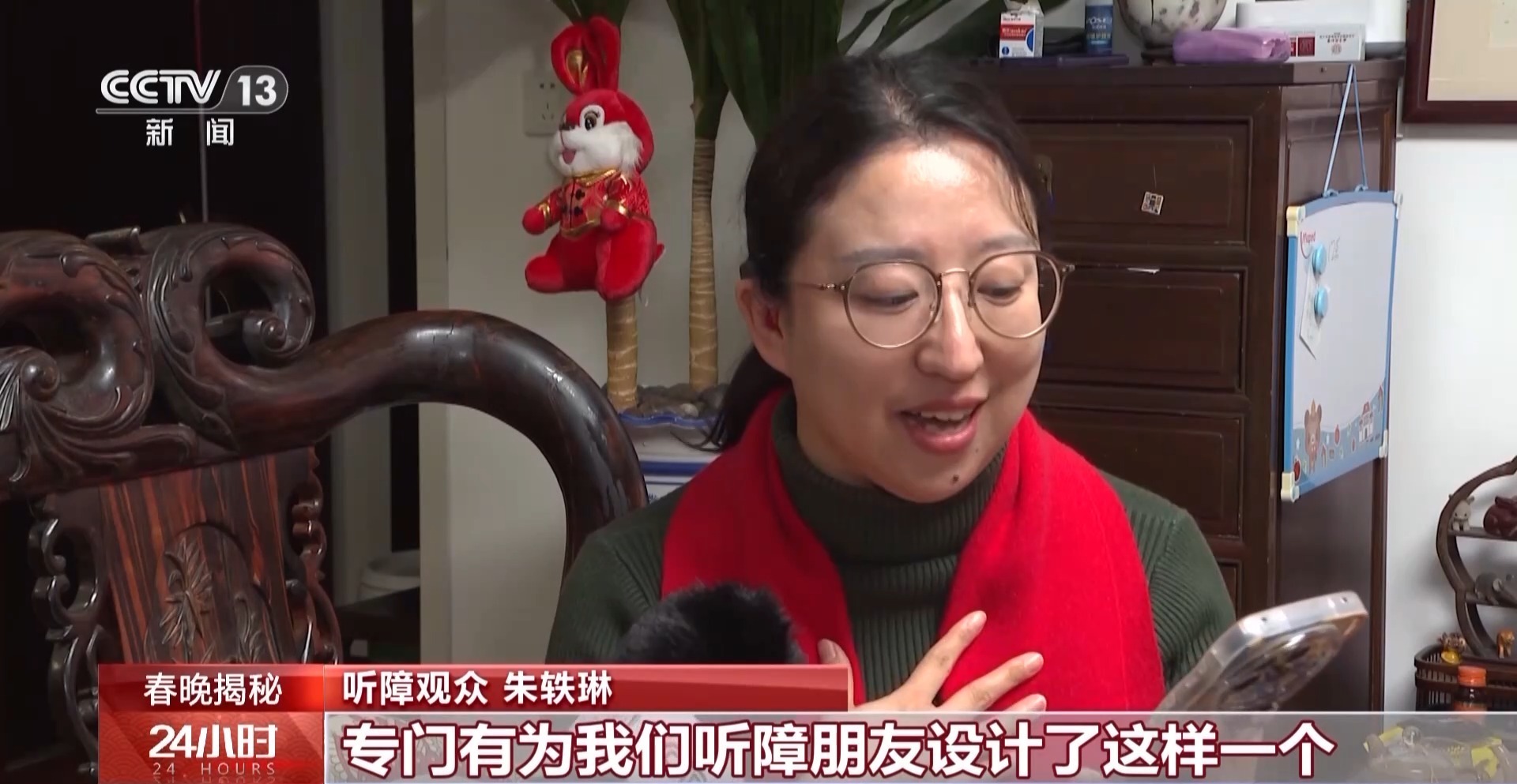 听障观众 朱轶琳:专门有为我们听障朋友设计了这样一个无障碍转播春晚,看起来就非常感动,这个形式也是特别暖心,观看的沉浸感投入感更强一些。