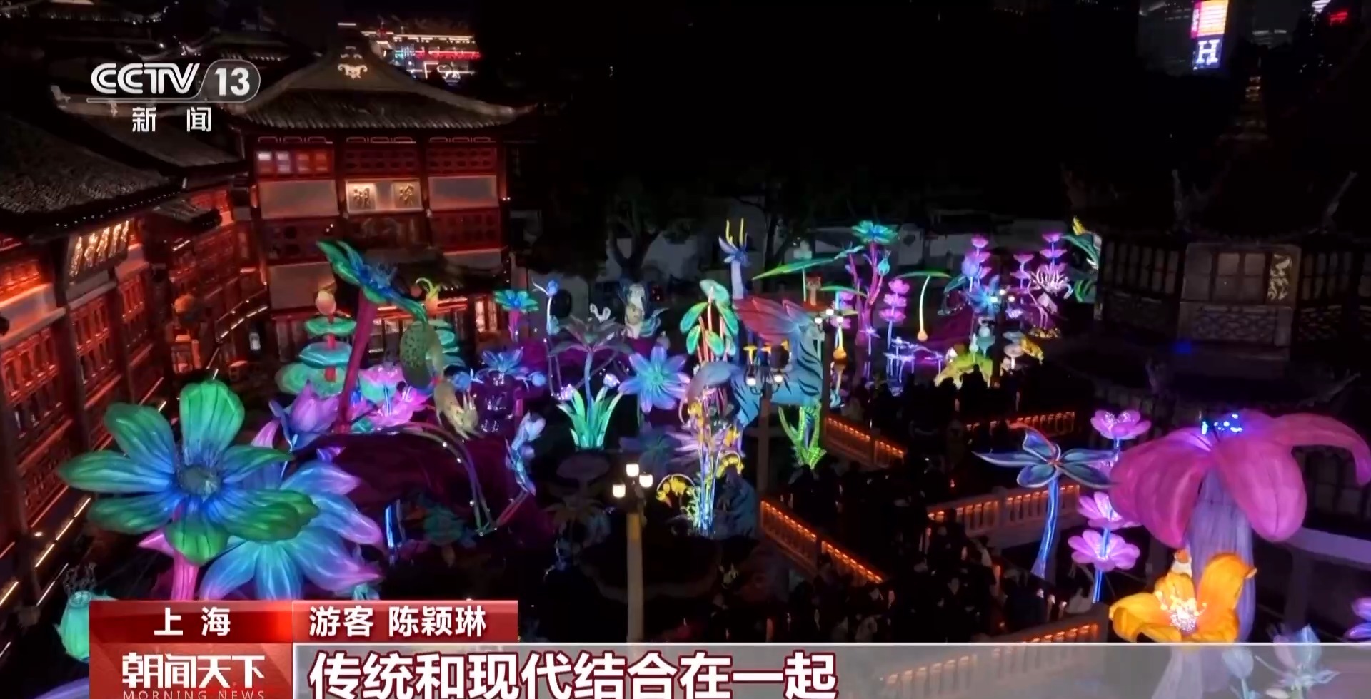 游客 陈颖琳:一些光影的投射,晚上好像会有一些比较动态的3D光影,传统和现代结合在一起,就挺有创新的,觉得比较适合阖家欢乐的一个地方,也很有新春的气息。
