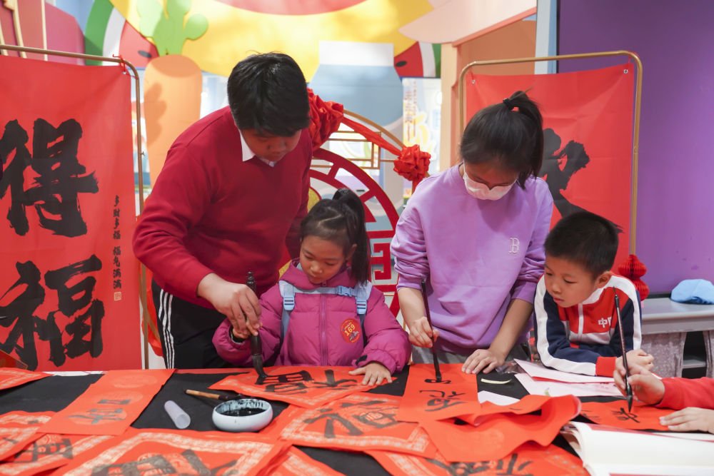 “传统技艺我传承”版块通过开展写春联、剪纸、绳编、制作智能宫灯等,让少年儿童感受传统手工艺与现代科技相结合的奇妙。“年俗文化我来学”版块通过开展书画作品征集展示、亲子讲座、亲子知识挑战等,引导家长和孩子共话春节习俗。“民俗游戏大联欢”版块则以投壶、猜谜、抽陀螺、抖空竹、滚铁环等活动,让孩子们感受民俗游戏的乐趣和内涵。“传统美食制作坊”版块邀请家长和孩子们动手包饺子、制作糖画和传统糕点等。“舞蹈民乐欣赏汇”版块吸引儿童家庭聆听经典戏曲选段、民乐演奏会、中外音乐会等。“翰墨丹青展华章”版块通过举办书画作品展览,设置二十四节气、春节等传统文化知识展板,为儿童家庭献上新春文化盛宴。