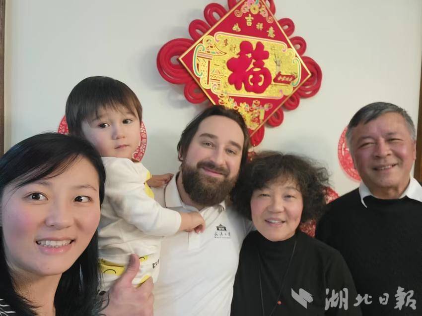 除夕之夜,在武汉大学文学院樊星教授家中,他的女儿樊博和法国丈夫拉斐尔带着两岁多的儿子,与樊星夫妇一起吃了团年饭,并在“福”字挂饰前留下了一张幸福的团圆照。