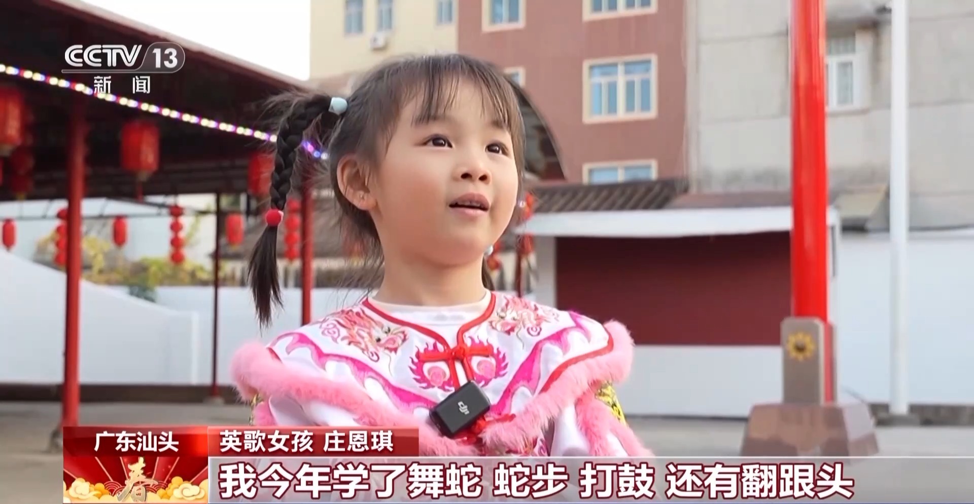英歌女孩 庄恩琪:刚才姐姐教我平槌,姐姐跳得很好看,我也想学。我最近学了翻跟头,我可以连续翻三个,我今年学了舞蛇、蛇步、打鼓还有翻跟头。