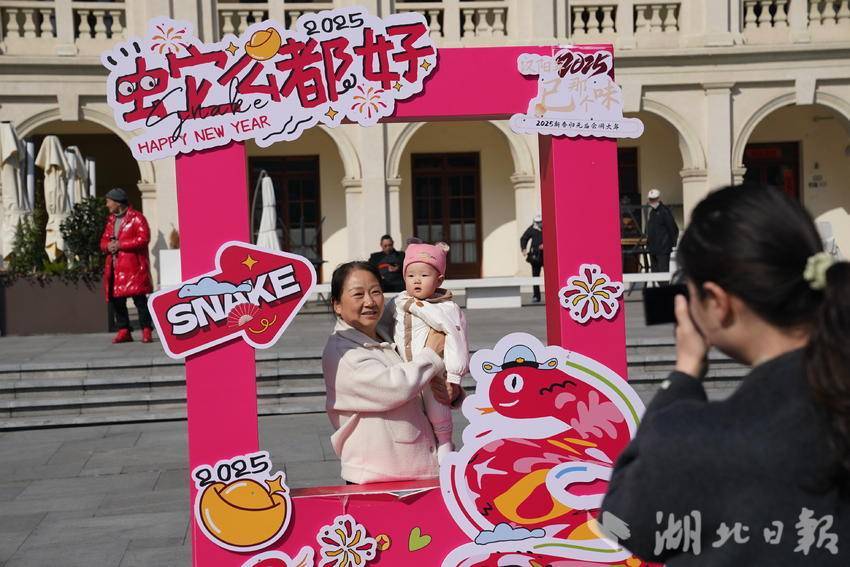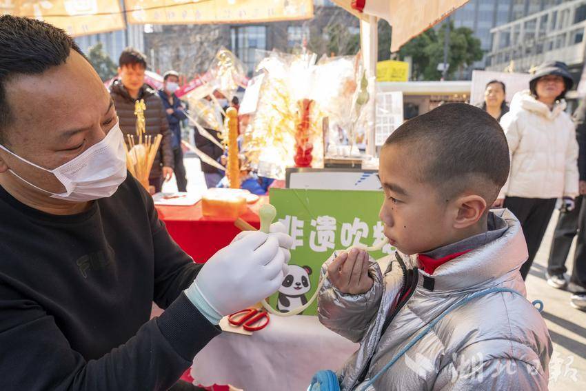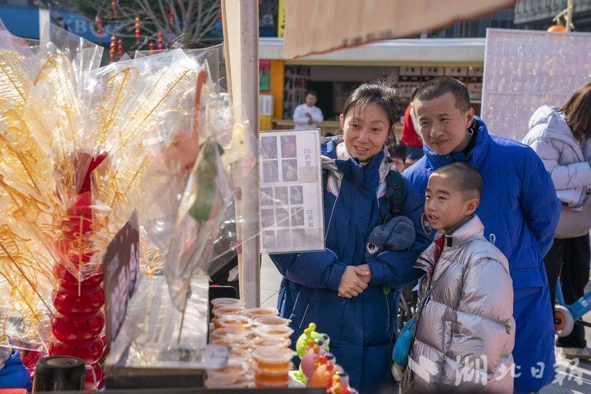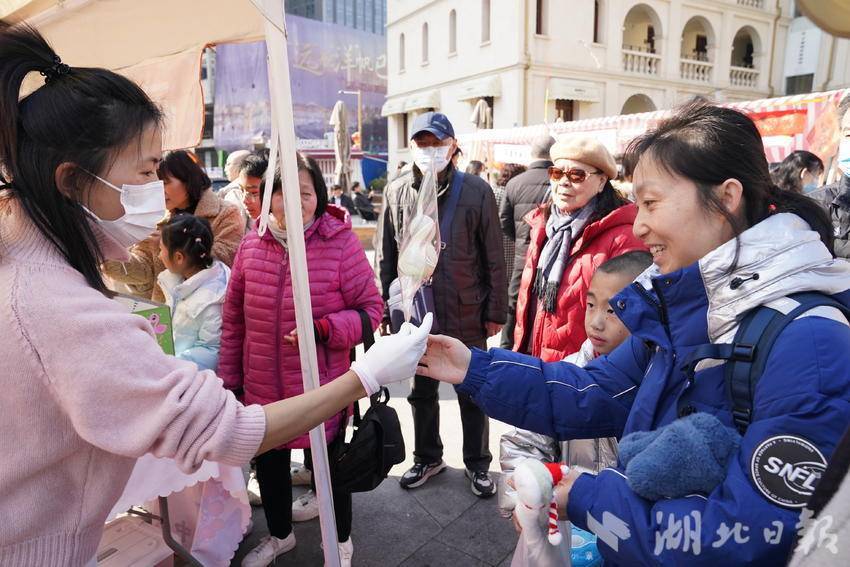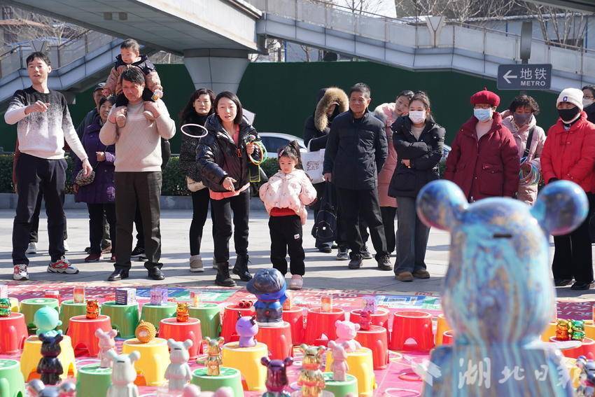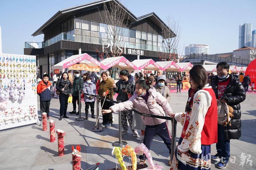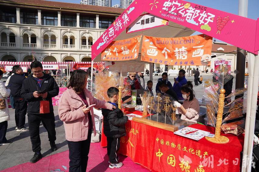 1月30日,2025新春归元庙会汉阳远洋里主会场人头攒动。庙会的30多个摊位前,非遗传承人现场展示吹糖人、糖画等技艺和投壶、套圈等非遗游乐项目,让市民近距离感受传统文化的魅力。传统美食区汇聚热气腾腾的饺子、年糕等特色小吃,满足人们的味蕾。互动打卡区设置了巨型气模抱抱球、蛇年创意拍照打卡框,增添了游玩乐趣,供市民游客拍照打卡留念。据悉,庙会从1月29日(正月初一)至2月12日(正月十五)举行,除远洋里圣母堂广场主会场,另设4个分会场分别是武汉冰雪中心分会场、晴川阁分会场、龟山风景区分会场、方圆荟·奥特莱斯分会场。(湖北日报全媒记者 魏铼 摄)
