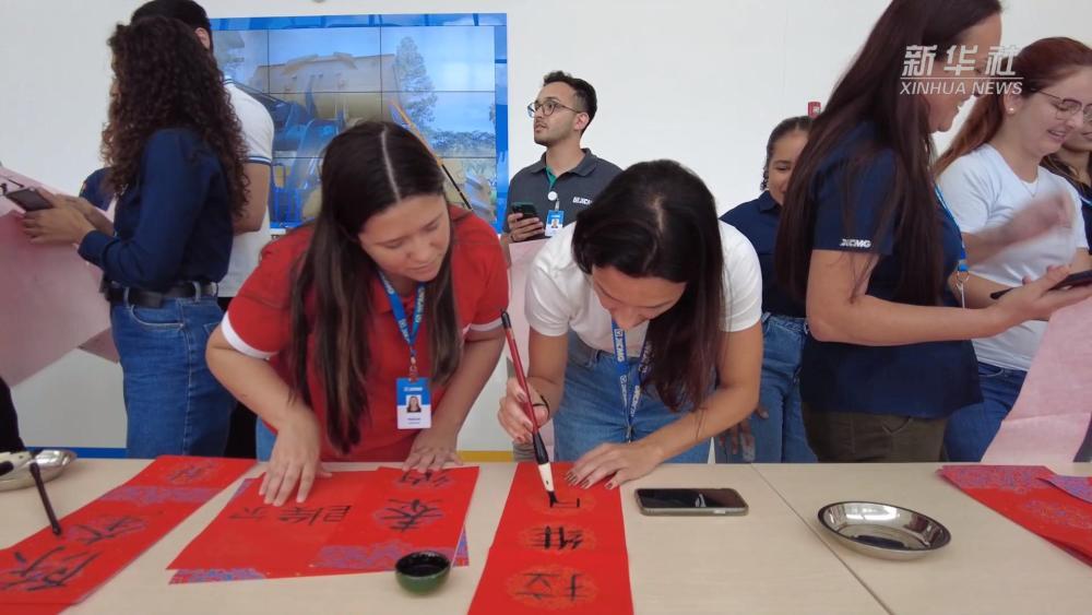 车间内,在临时摆起的长桌旁,当地员工在中方员工指点下或者看手机视频自学,仔细地在红纸上学写“福”字和春联等,并互相拍照留念。