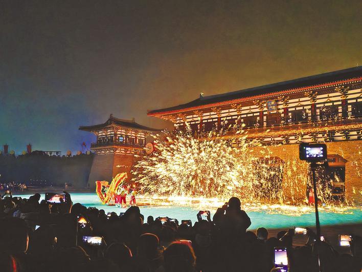 1月29日,襄阳盛世唐城景区开启火龙钢花表演。