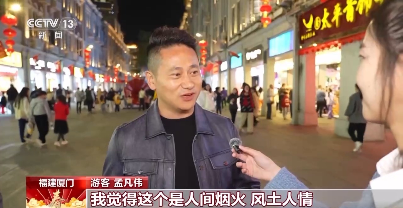 福建厦门游客 孟凡伟:和家里人在一起,一面逛一面吃,我觉得这个就是年的意义。大家到了晚上都喜欢出来玩,出来吃夜宵,我觉得这个是人间烟火、风土人情,大家都生活得很幸福。