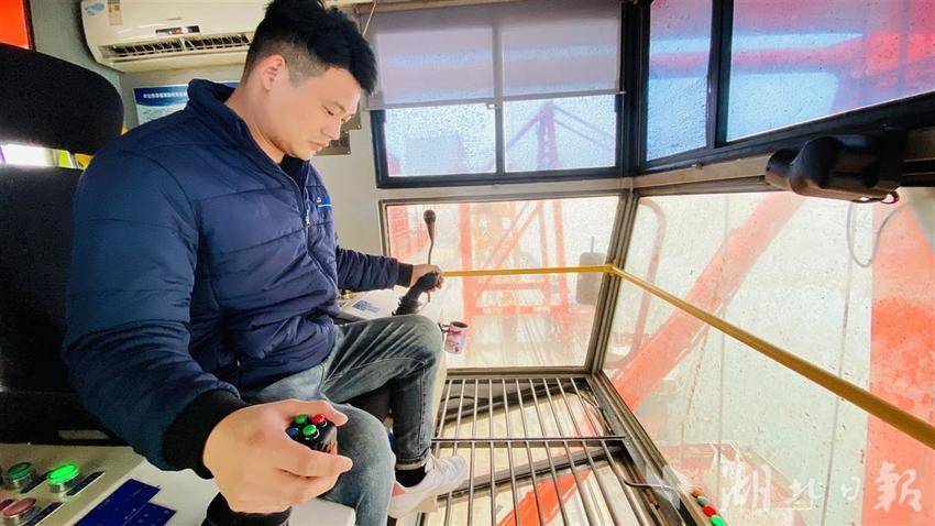 “陈师傅,新年好!”上午10时许,湖北日报全媒记者冒雨登上岸桥式起重机,转过一层层之字型镂空舷梯,在离地18米高的驾驶室,见到了操作手陈飞。