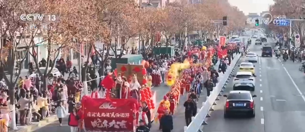 在江苏宿迁,民俗巡游活动热闹上演,伴随着喜庆热闹的锣鼓声,七仙女、财神爷等神话传说中的人物惊艳亮相,不时与市民热情互动。身姿矫健的龙狮队伍,翻腾跳跃、活力四射,更是将现场气氛推向高潮。市民们跟随着巡游花车一路向前,在苏北琴书、钱杆舞等精彩的非遗项目中感受浓浓的年味。