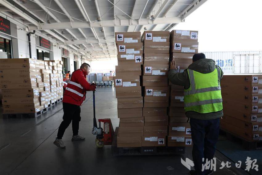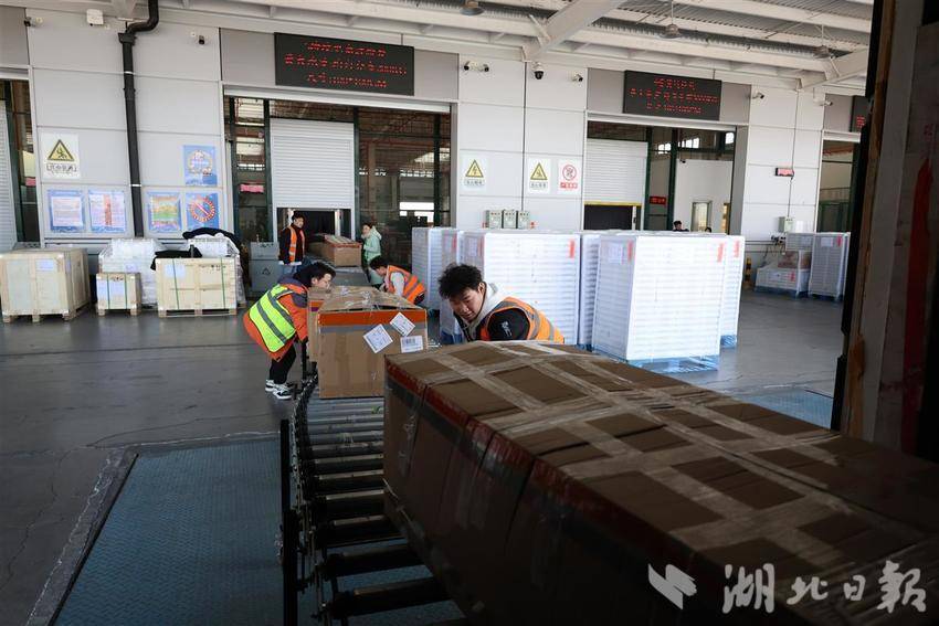 1月29日,农历正月初一,鄂州花湖国际机场北部货站一片忙碌。出港区月台上,4家货代公司一字排开,工人们将货物从货车上搬下来,送上传送带过安检。