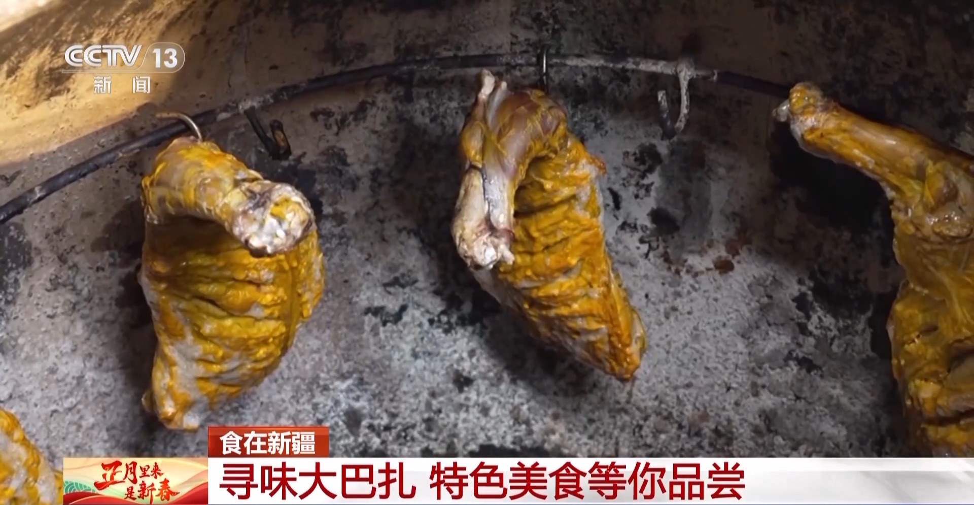 要说新疆美食,馕坑烤全羊那是必打卡的。新鲜的羊排配上面粉、鸡蛋、姜黄、食盐,放入200多度的馕坑中烤上大约1小时,便可出炉了。