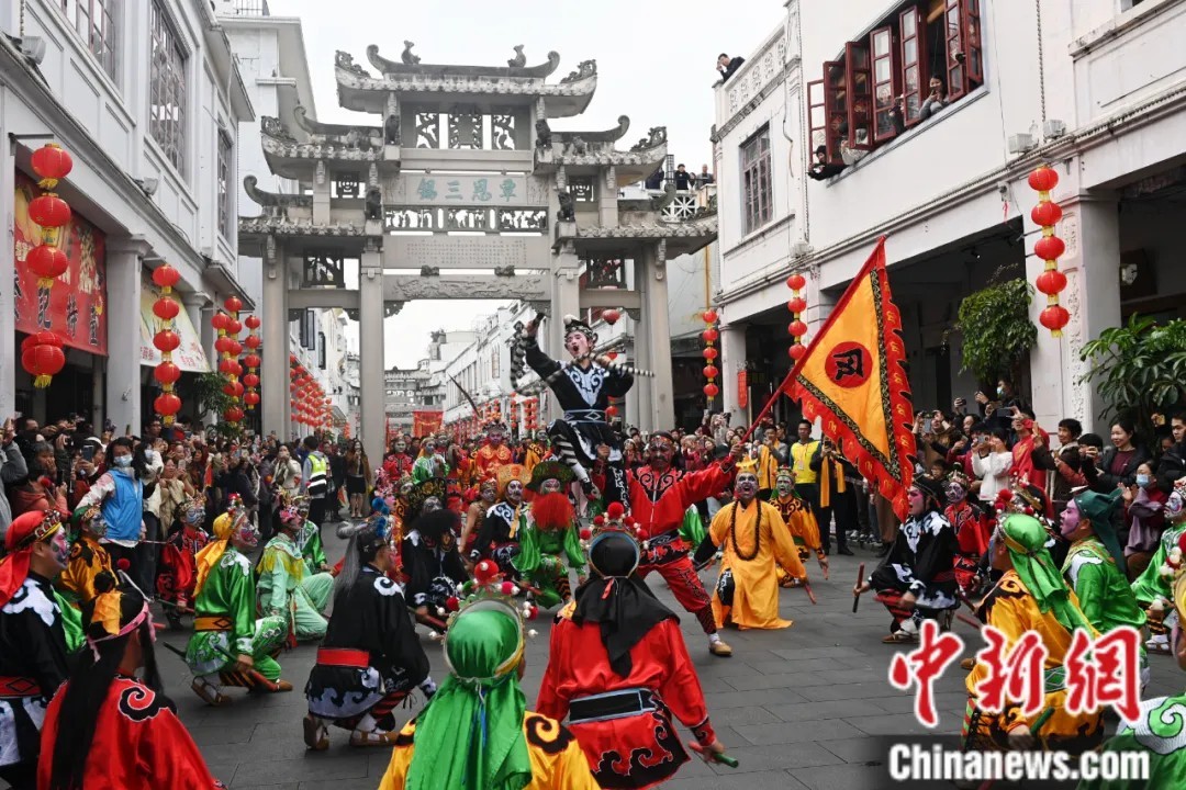 2024年3月4日,2024“潮州青龙庙会”非遗文化巡游活动在广东省潮州市举行。图为普宁泥沟英歌队在潮州牌坊街表演。中新社记者 陈楚红 摄