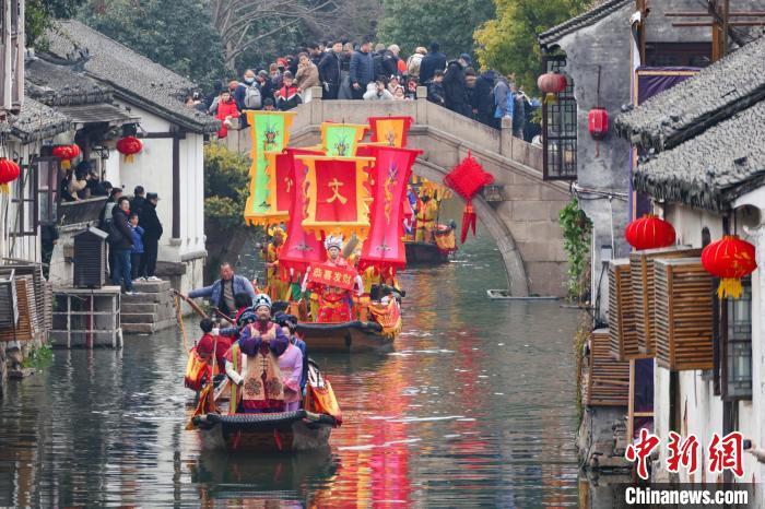 2月2日,周庄的水陆迎财神体现出浓厚的水乡特色。 中新社记者 泱波 摄