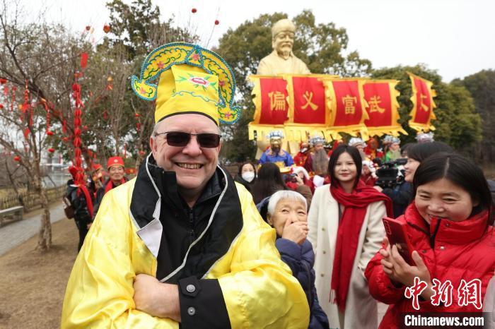 2月2日,埃里克穿着一身传统的中式服装开心地参加迎财神仪式。 中新社记者 泱波 摄