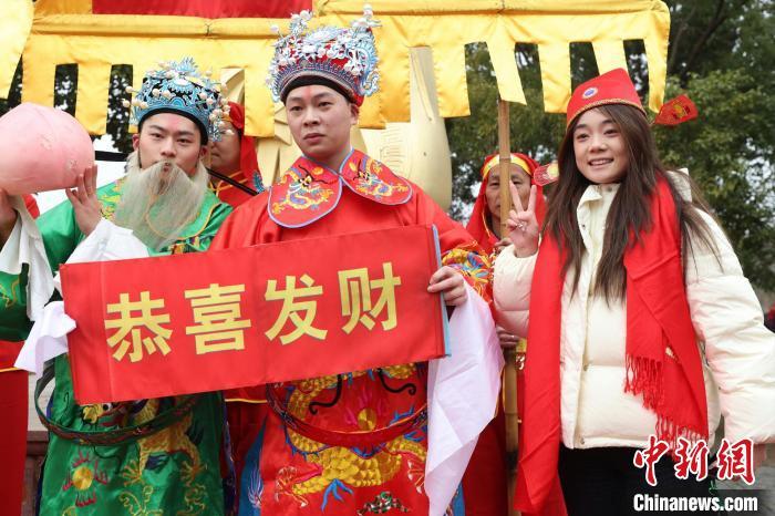 2月2日,民众们与“财神”合影,祈求一年的好运道。 中新社记者 泱波 摄
