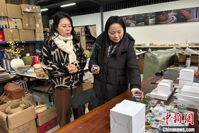 图为陈贵静(右)在台胞的广达窑艺陶工坊。记者 王鹏 摄