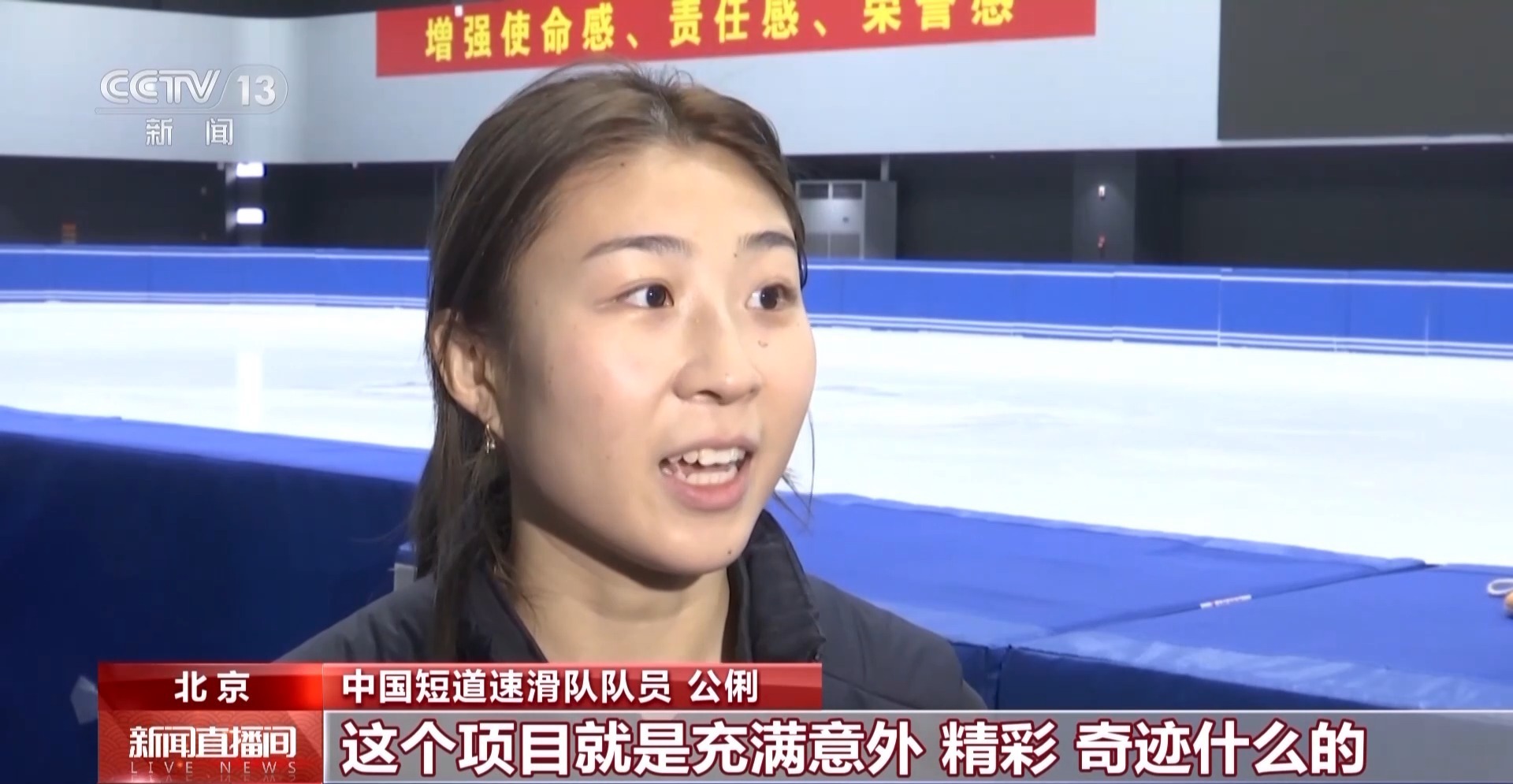 中国短道速滑队队员 公俐:没有什么压力,因为我觉得我也不怕,就去跟对手拼,做到自己最好,能争取最好的成绩。因为短道速滑这个项目充满意外、精彩、奇迹,我觉得不到最后一刻,谁也不知道谁是赢家。