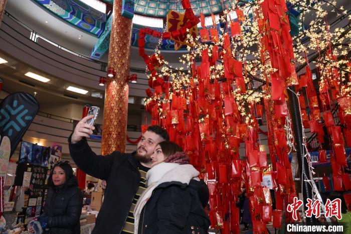 当地时间2月1日,加拿大卡尔加里,在卡城中华文化中心举办的乙巳蛇年新春嘉年华活动中,现场的“红包树”吸引来客留影。 中新社记者 余瑞冬 摄