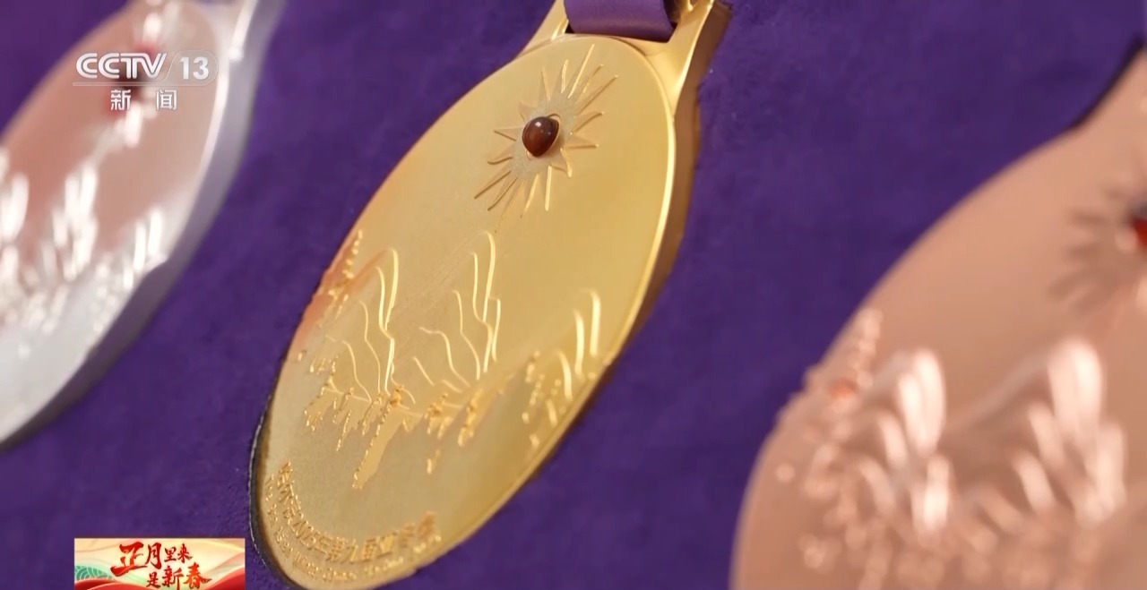 黑龙江设计集团创意设计研究院院长 邹存亮:我们团队在奖牌设计上的创新,最主要的就是这一抹“中国红”。它是产自我们黑龙江逊克县的北红玛瑙,颜色非常鲜艳,也是我们黑龙江的瑰宝。红色是我们中国的一个代表原色,也是我们民族精神的象征。它像一轮喷薄而出的红日,照耀着龙江大地,也昭示着我们冰雪健儿在赛场上的拼搏激情与活力。