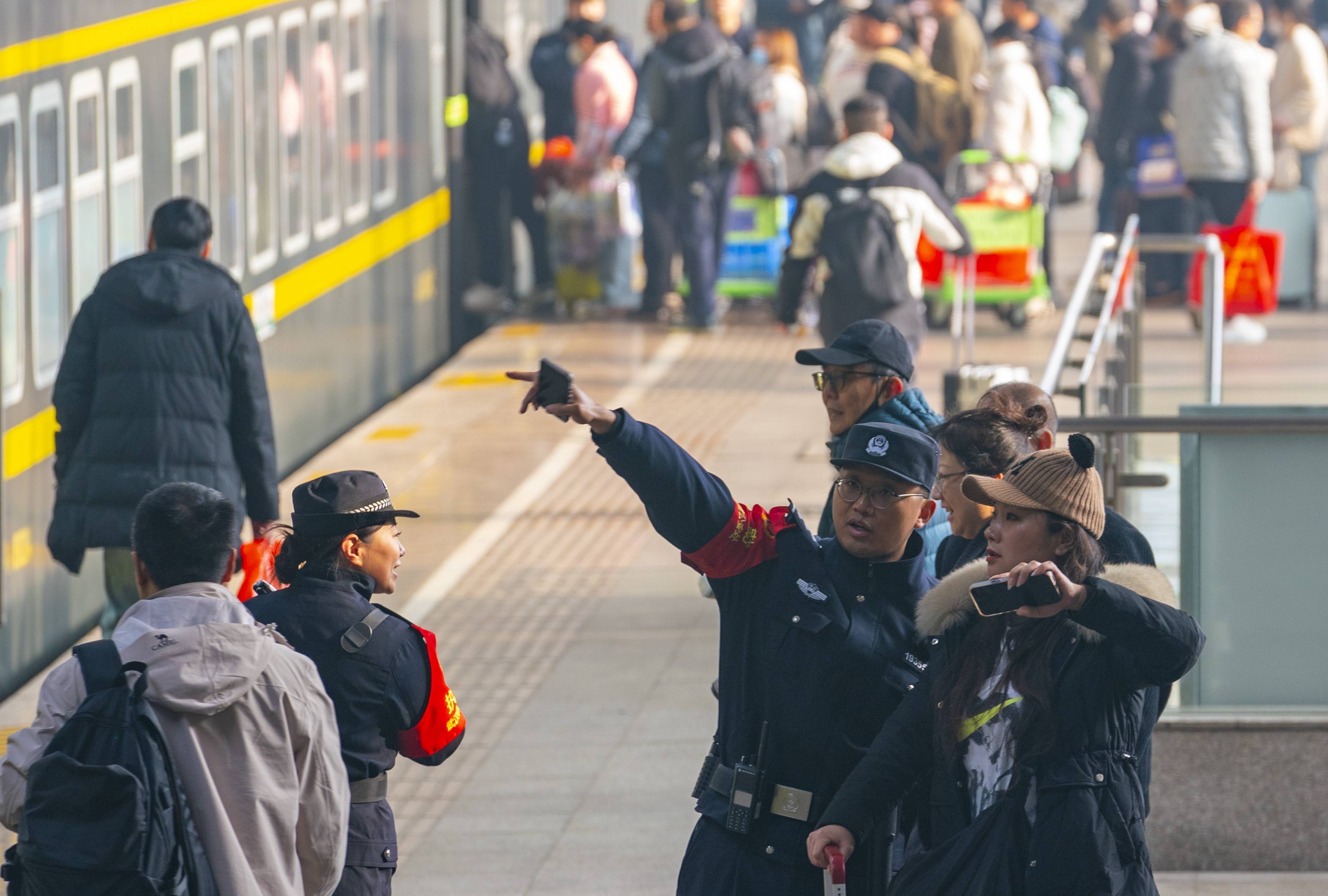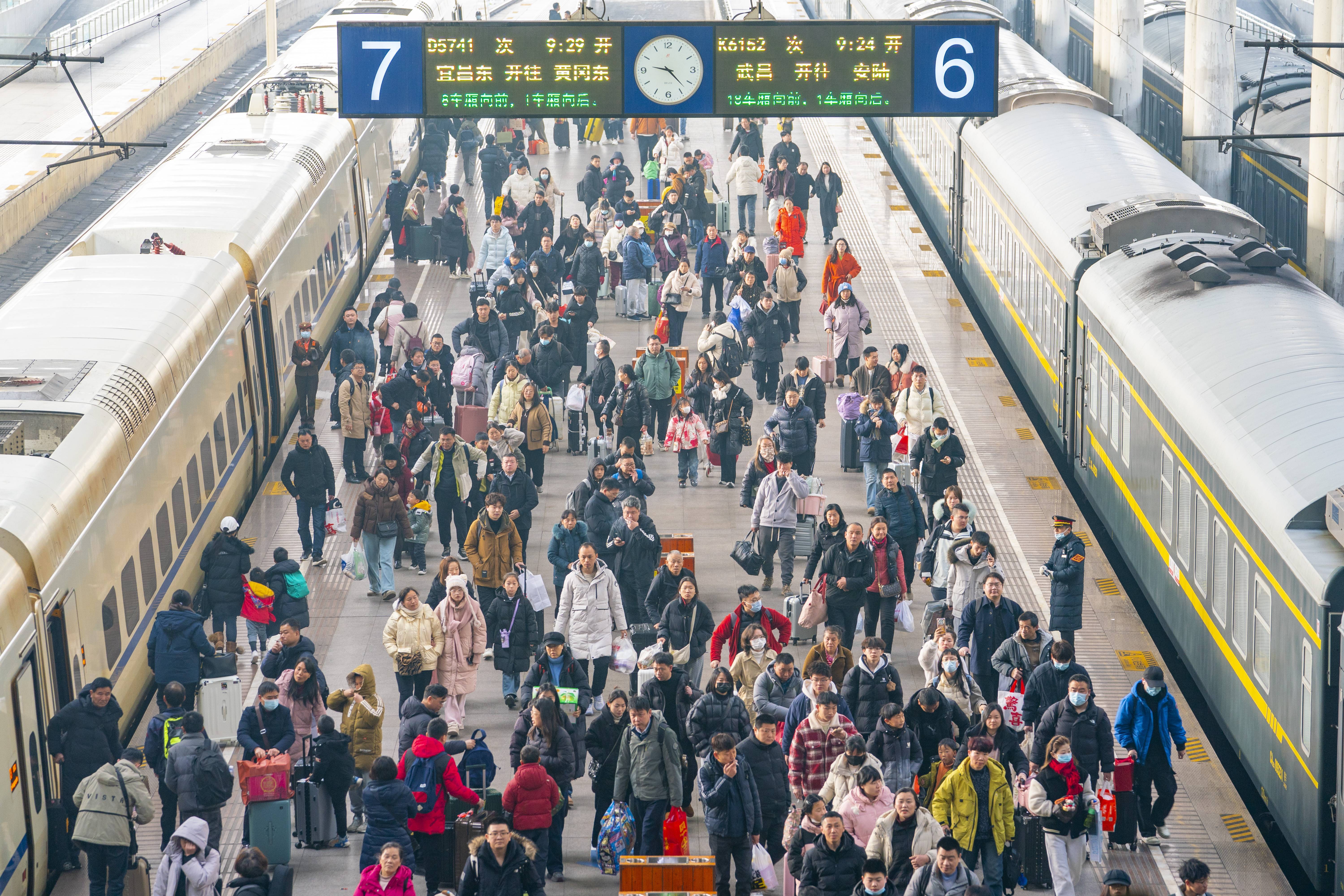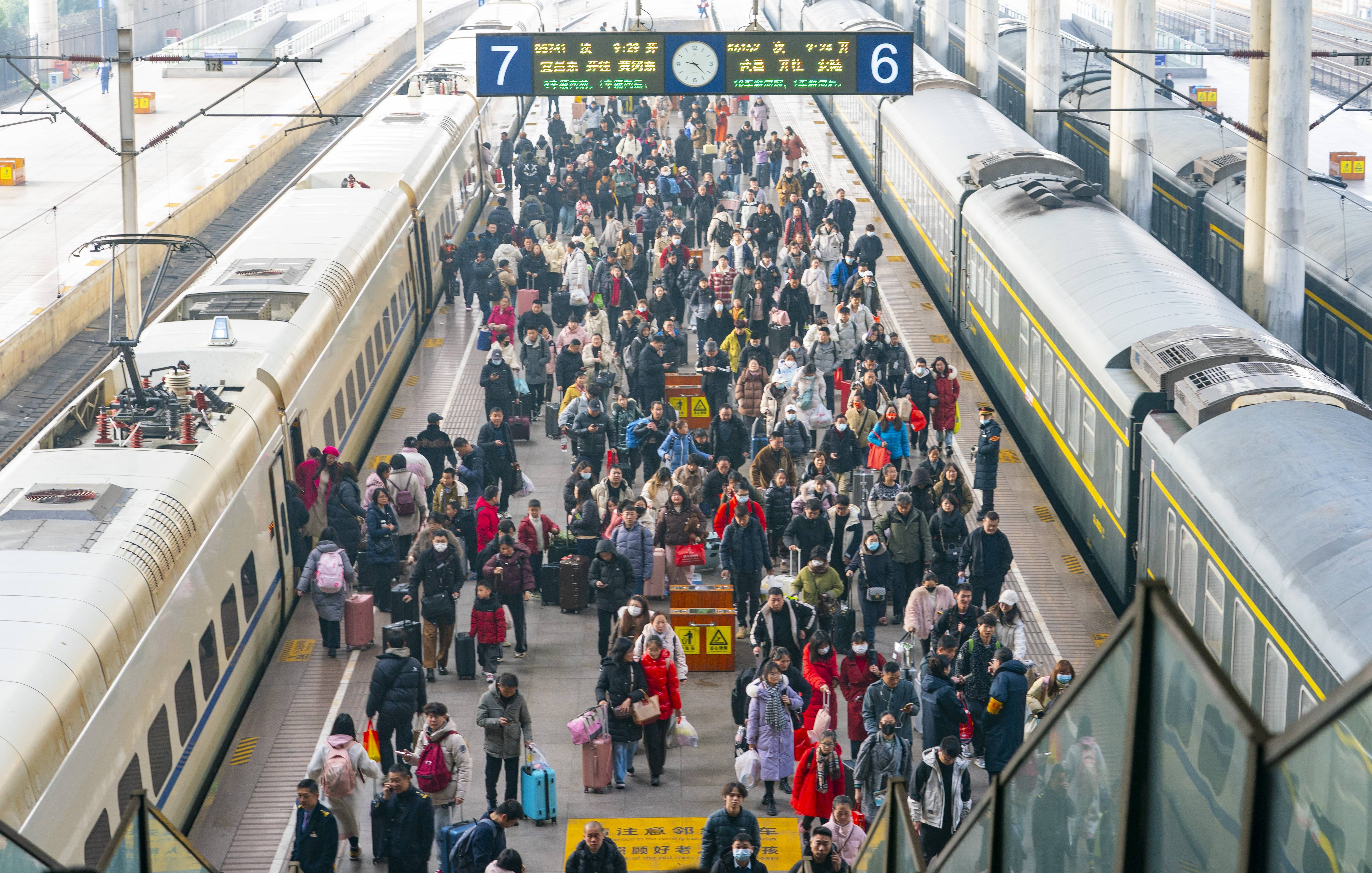 2月3日正月初六,武昌火车站站台,到达旅客有序出站。据预测,2月2日至2月4日,武汉铁路客流客流每天以10万人次的增幅快速攀升。武汉铁路部门积极应对返程客流高峰,加大热门方向运力投放力度,落实便民利民举措,努力保障旅客平安、有序、温馨出行。武汉铁路公安机关紧盯重点客运车站、重点列车、重点时段,科学合理部署警力,加强进站口、安检口、出站口等重点区域的巡逻检查。