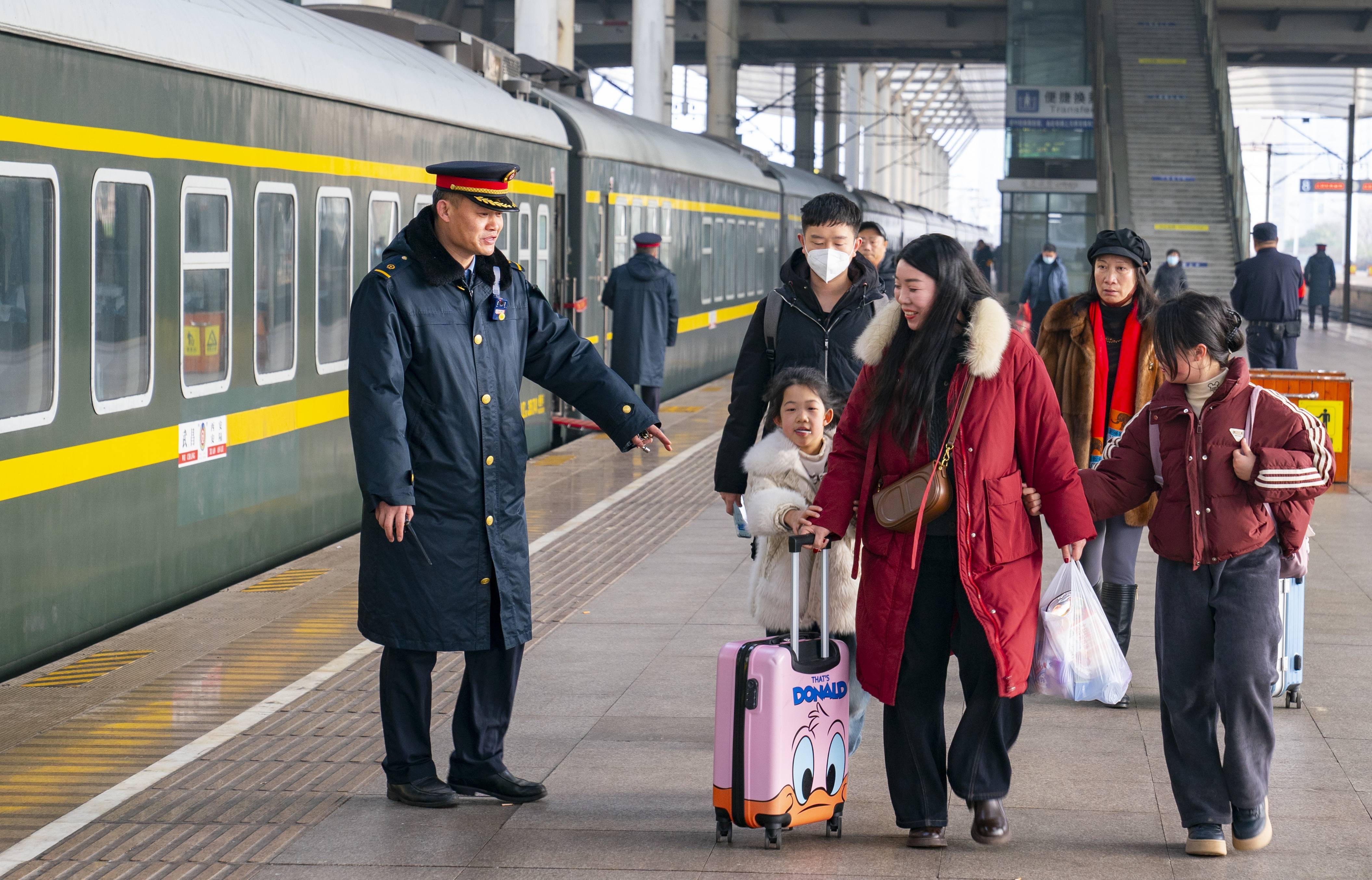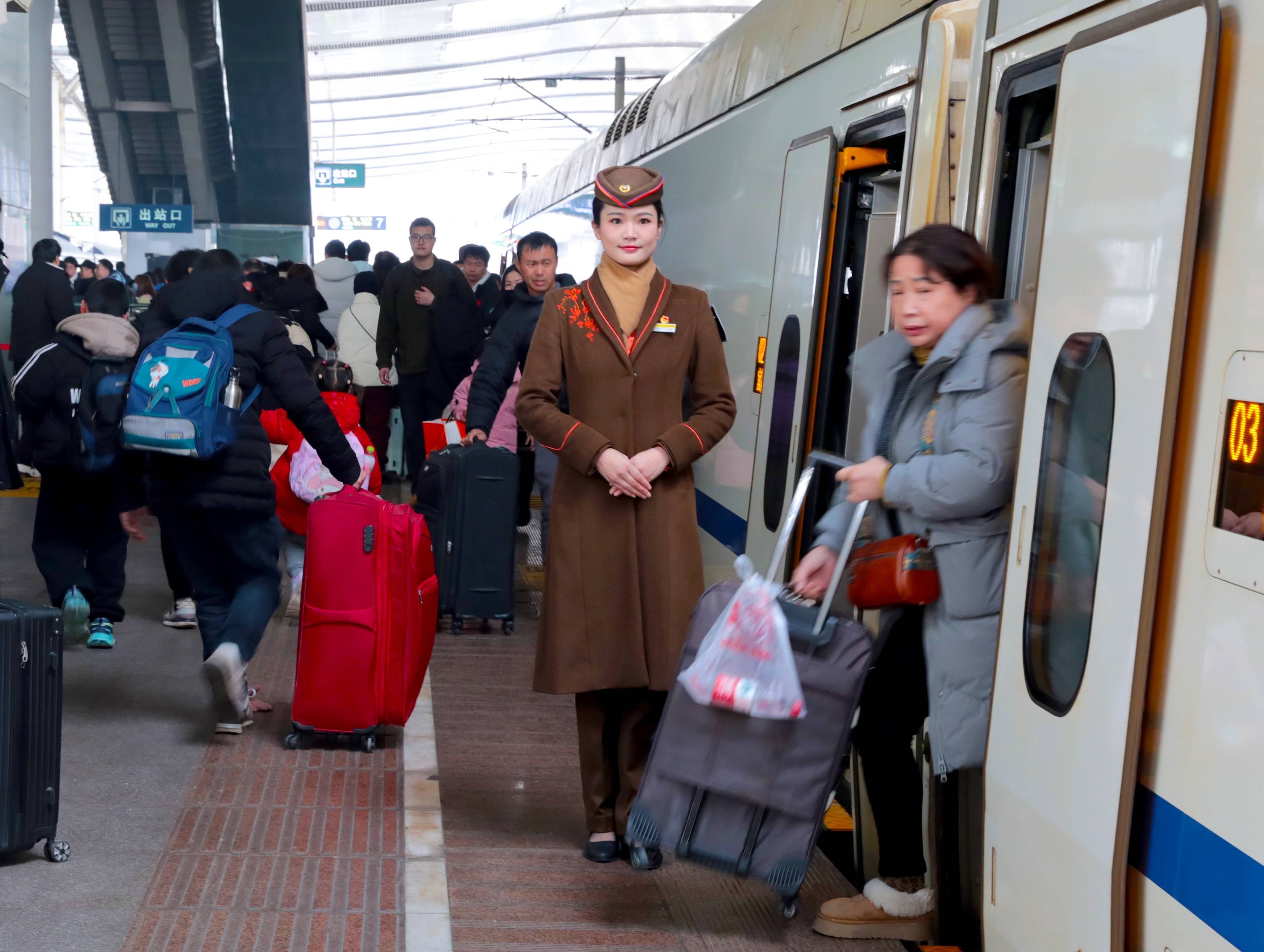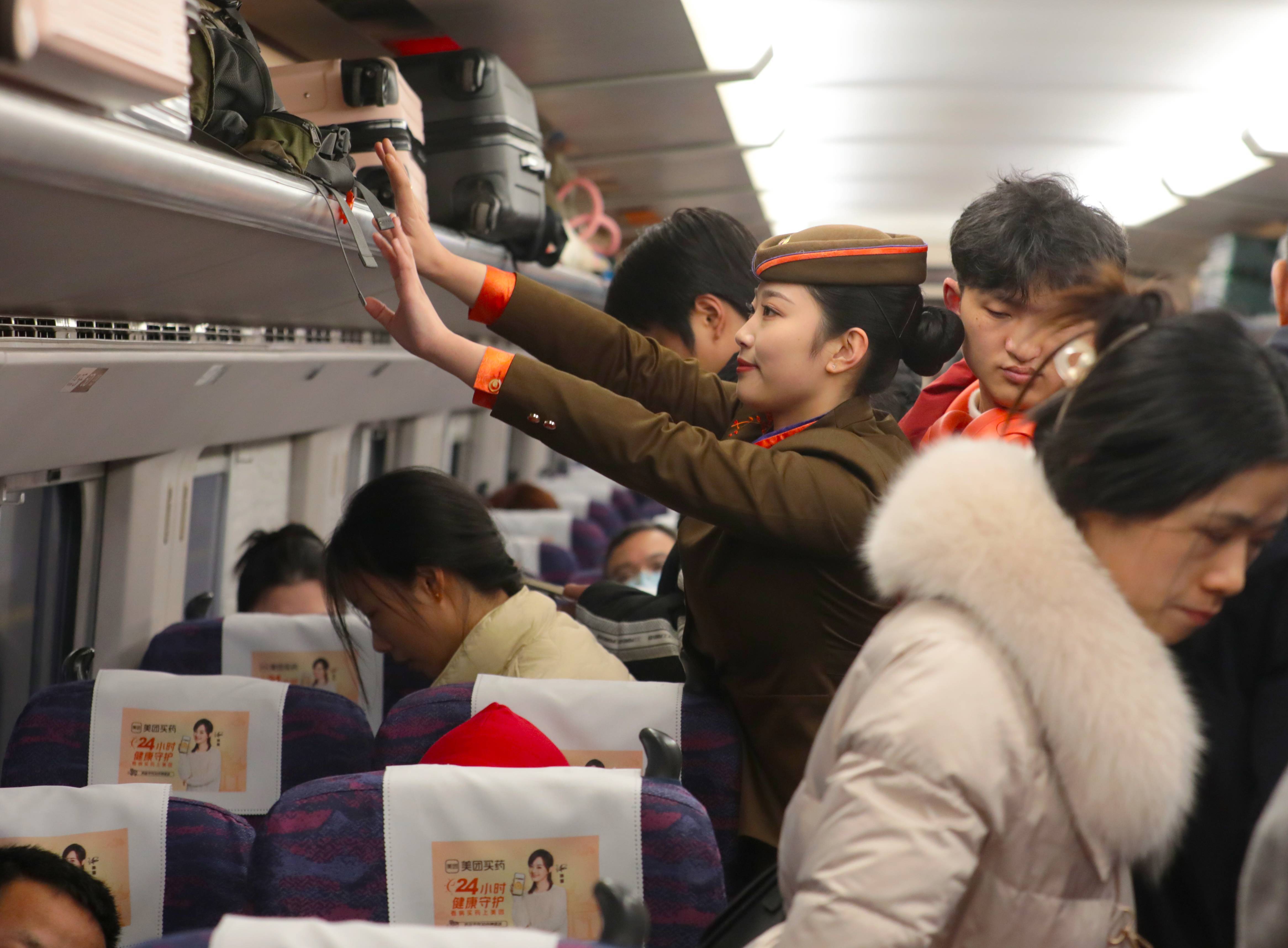 武昌火车站,列车工作人员帮助旅客有序乘车。