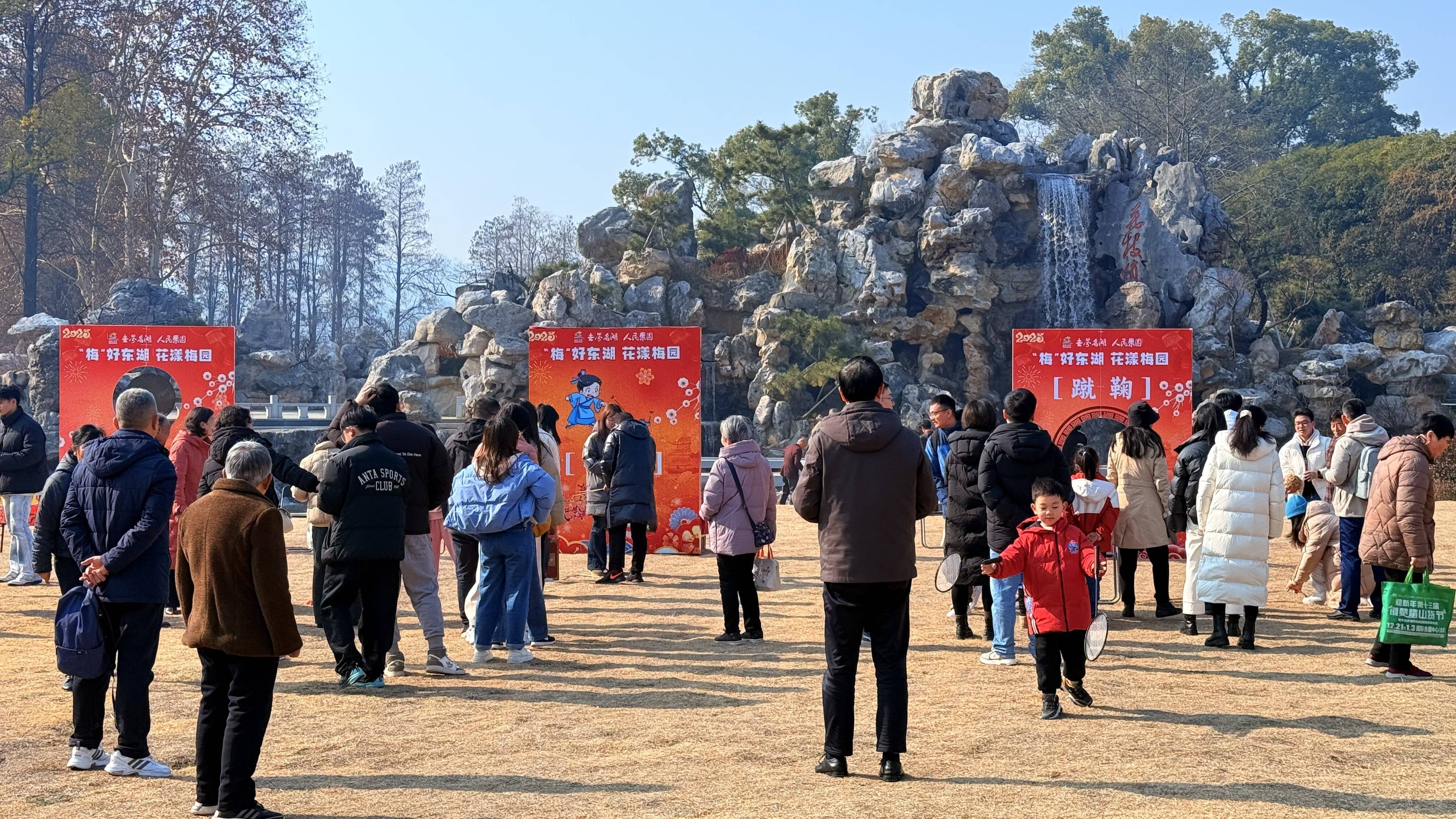 梅园大草坪上蹴鞠、投壶、蒙眼敲锣等小游戏轮番举行,游客在现场免费参与互动。“不要人夸颜色好,只留清气满人间。”《墨梅》这首诗词改编成舞蹈,诗与舞的交融绘声绘色地演绎了梅花的品格;装扮成仙鹤的工作人员与游客展开一场诗词互动,精彩的对诗引起现场的阵阵欢呼;梅妃亭、梅影琴韵处则进行着戏腔表演和民乐表演,让游客的赏梅过程更为有趣,体验更加精彩。