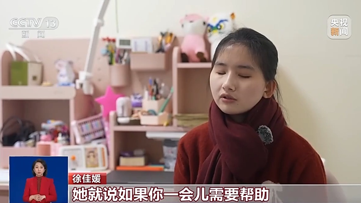徐佳媛:她就说如果你一会儿需要帮助,你可以找我,然后我就感觉特别感动,也特别温暖。然后她能跟我分享,她还跟我说是什么颜色的,她还一一给我介绍,感觉她就是很有耐心、很温柔的一个小姐姐。