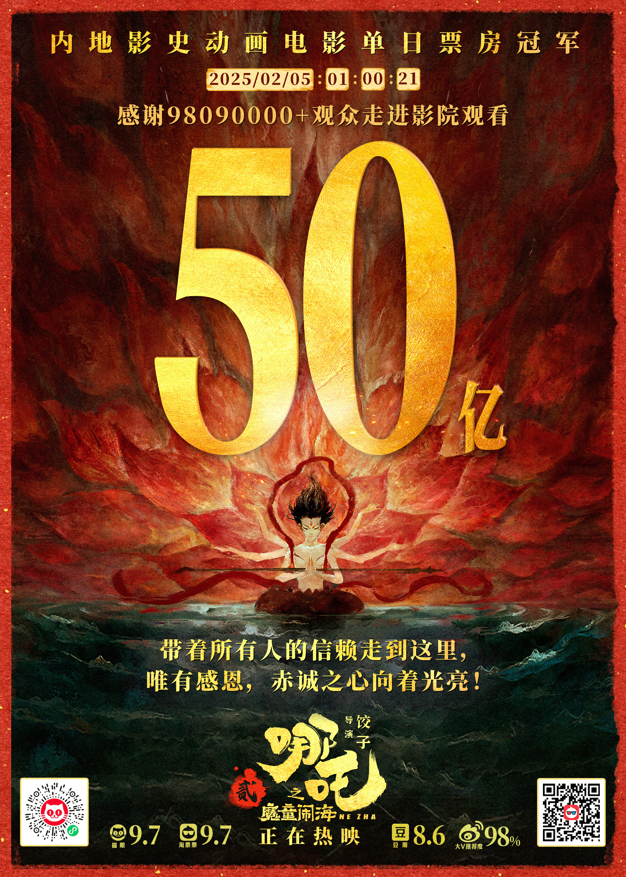 2月5日1时,《哪吒之魔童闹海》票房突破50亿元。目前中国影史动画片票房纪录保持者是《哪吒之魔童降世》的50.35亿元。