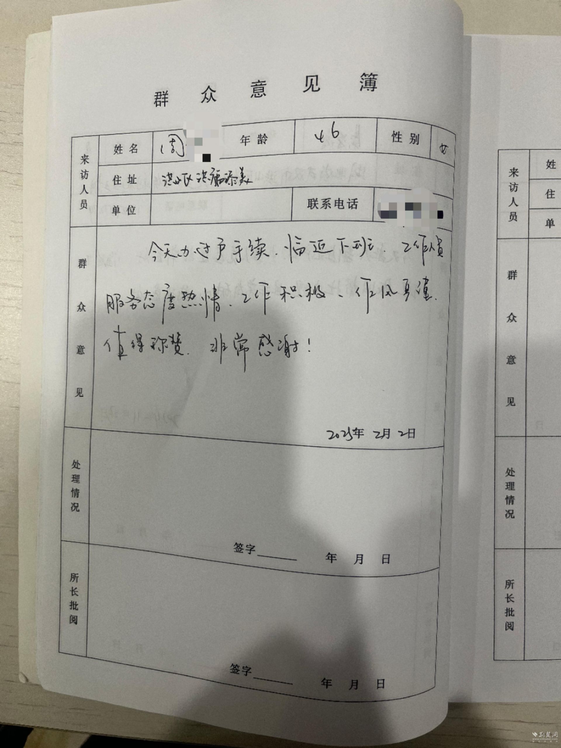 “我们想办理户口迁移,可没注意时间,来晚了,还能办吗?”2月2日下午,洪山区分局关山派出所户籍窗口刚刚结束当天的延时服务,一对夫妻带着女儿来到窗口略带歉意地问道。户籍民警朱荣立即返回工作岗位重启电脑,微笑着接过申请资料,有条不紊地为一家三口办理户口迁移手续。业务办理完成后,夫妻二人感激不尽,在留言簿上写下"工作人员态度热情、工作积极、作风严谨,非常感谢!"
