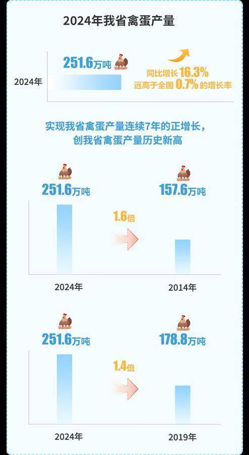 湖北日报讯(记者汪彤、通讯员谢毅)2月5日从省农业发展中心获悉,据统计部门反馈,2024年我省禽蛋产量达251.6万吨,创历史新高,同比增长16.3%,远高于全国0.7%的增长率。禽蛋产业正成为我省畜牧业高质量发展的重要支撑。