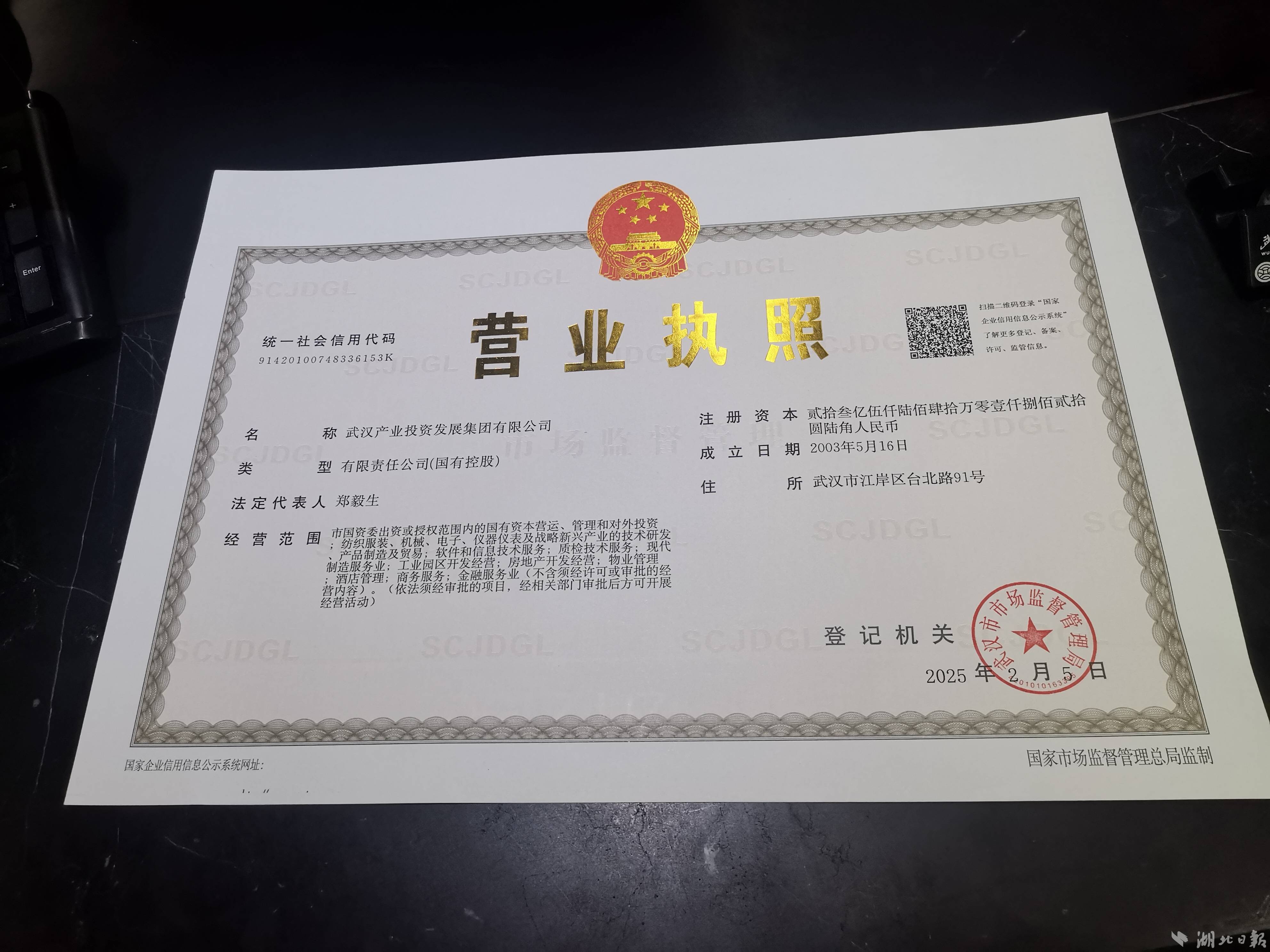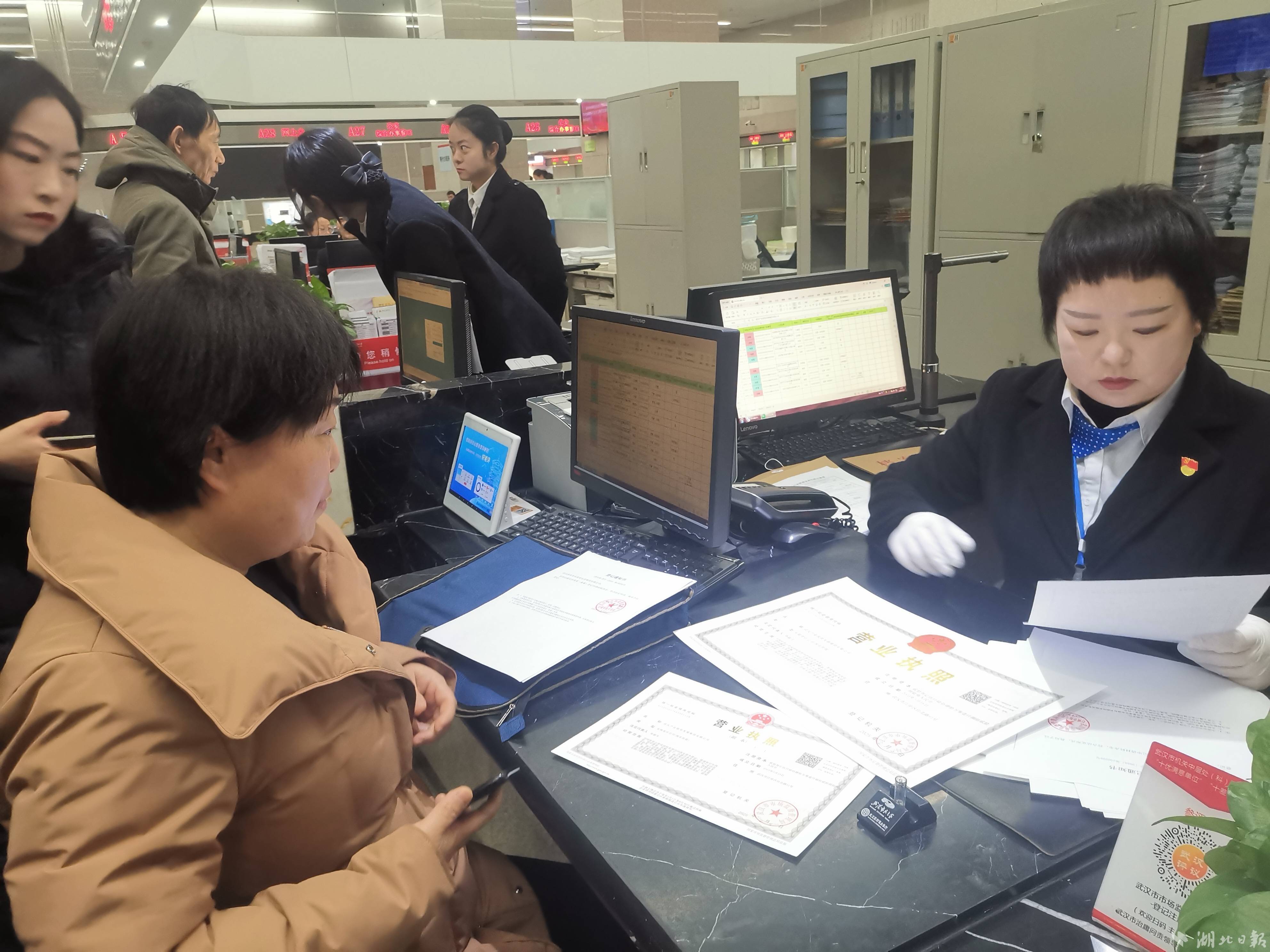 “新年好,这是贵公司的营业执照,请收好。”早上9点,武汉产业投资发展集团有限公司文员彭艳丽来到市民之家一楼B区市场监管局窗口,这里人声鼎沸,已经热闹起来。稍作等待,仅仅10分钟,彭艳丽拿到了企业股权变更后的一正一副两张崭新的营业执照。