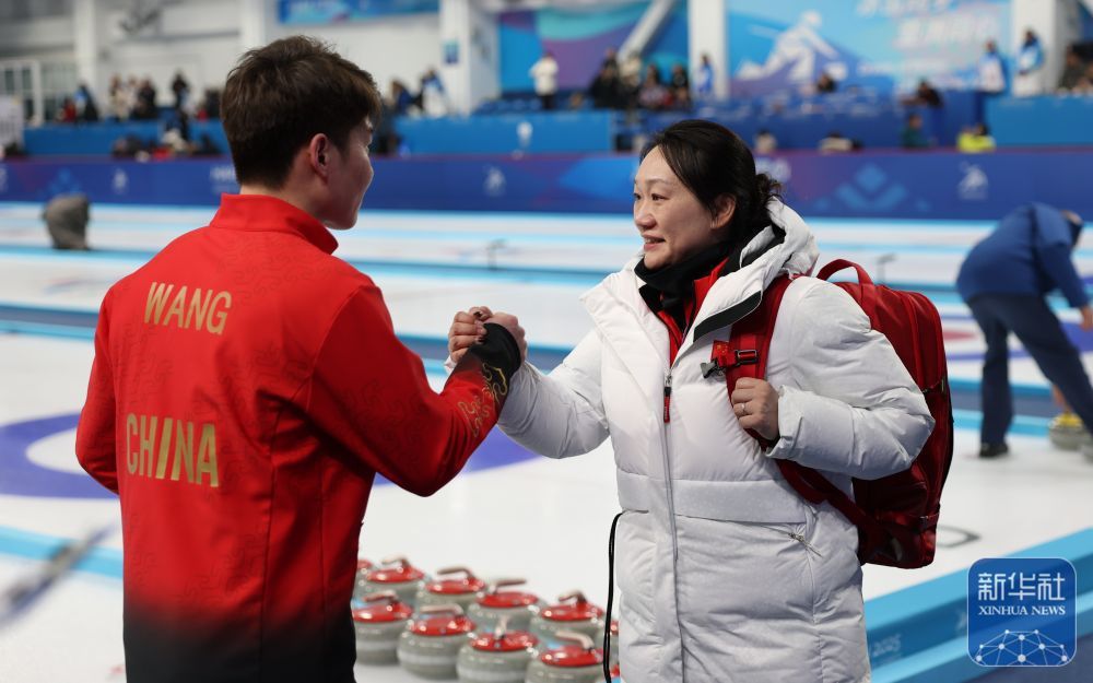 ↑2月5日,中国队选手王智宇(左)与教练周妍握手致意。