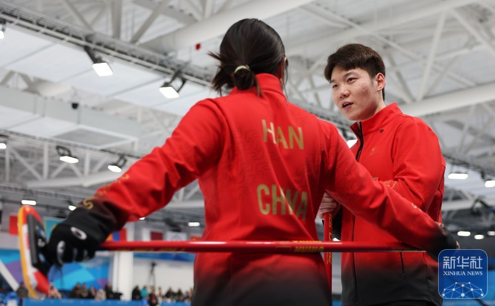 ↑2月5日,中国队选手王智宇/韩雨(左)在比赛中交流。