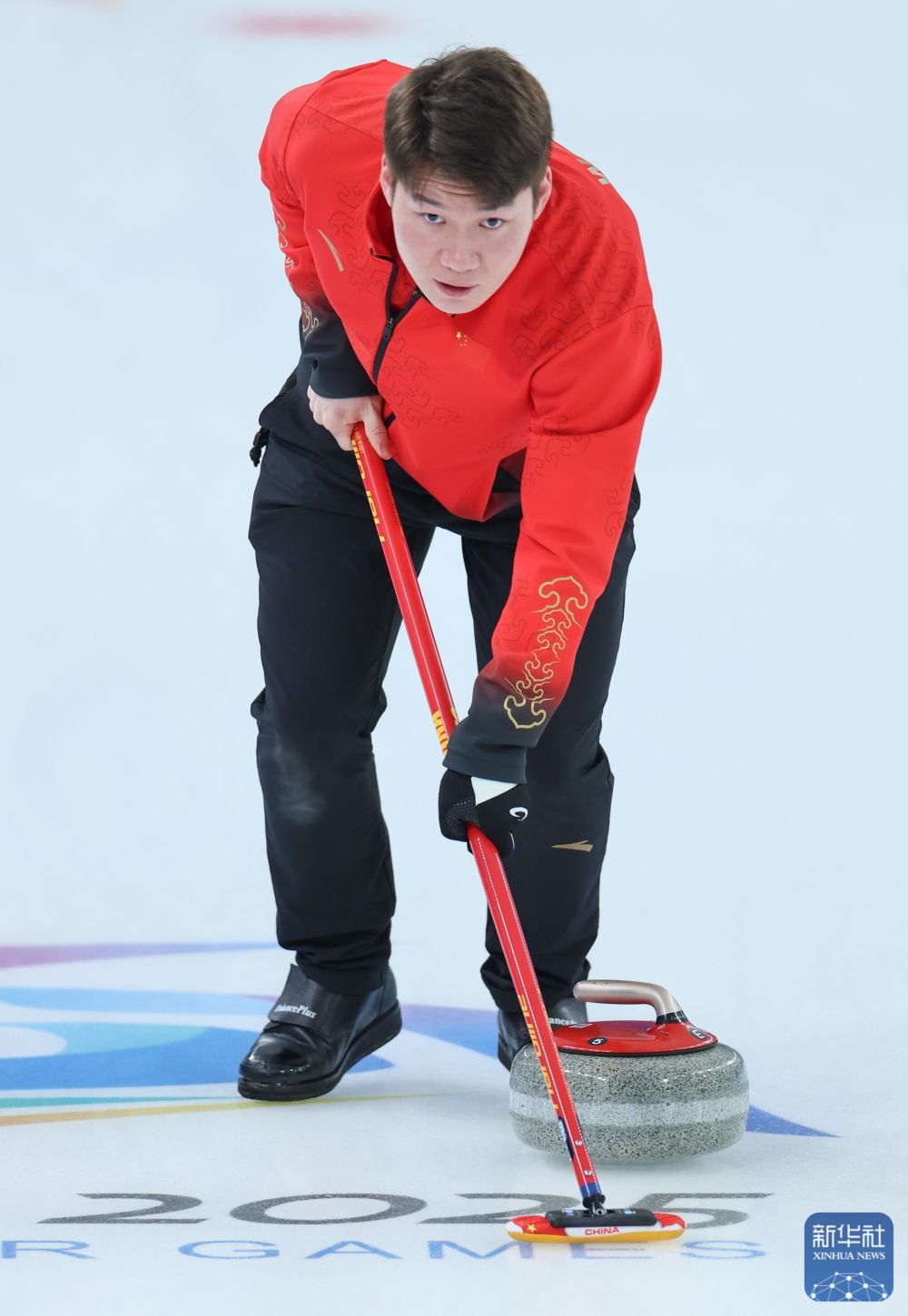↑2月5日,中国队选手王智宇在比赛中擦拭冰壶。