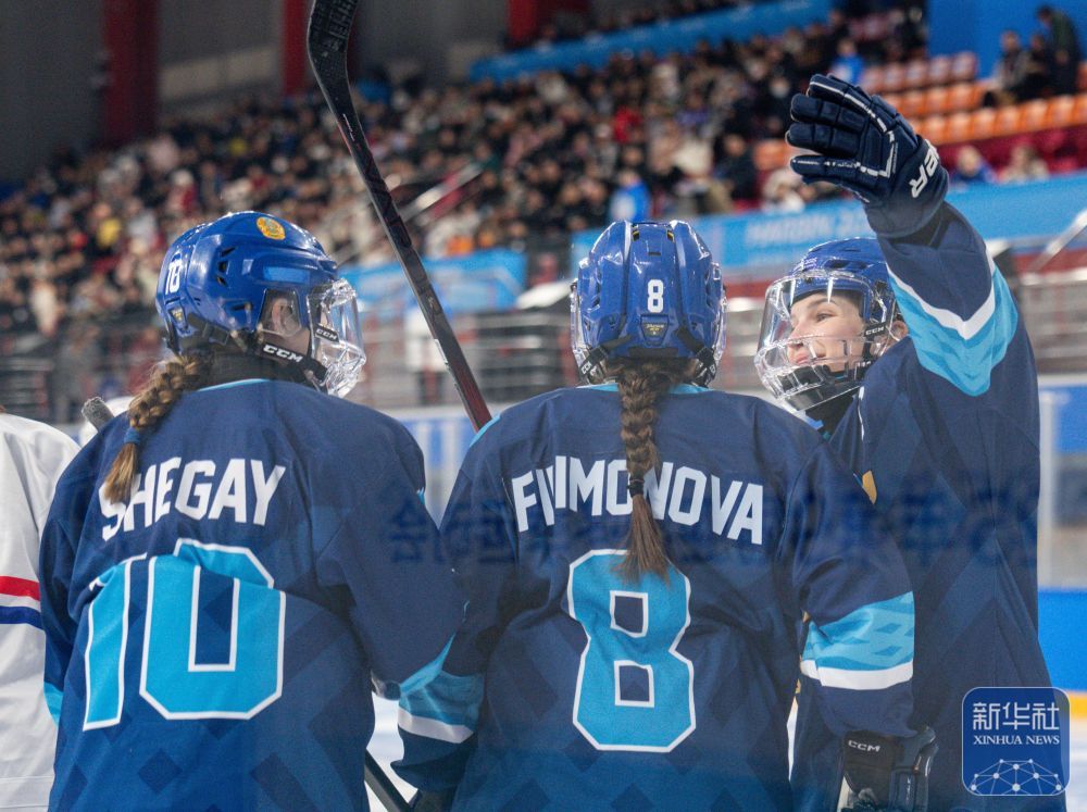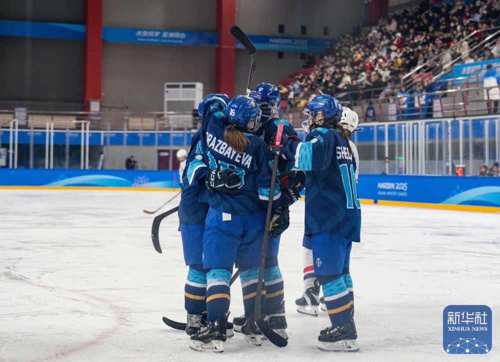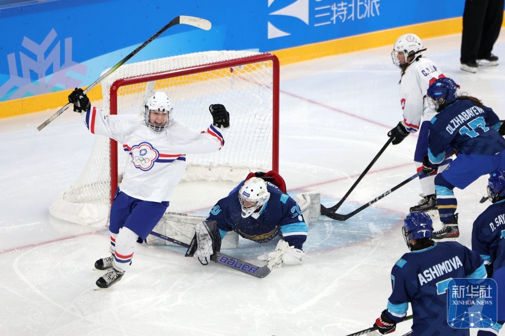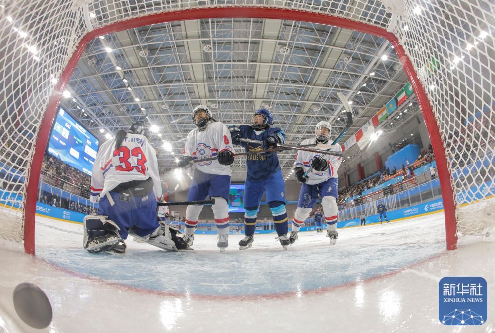 ↑2月6日,哈萨克斯坦队球员拉里莎·斯维里多娃(右三)在比赛中射门得分。