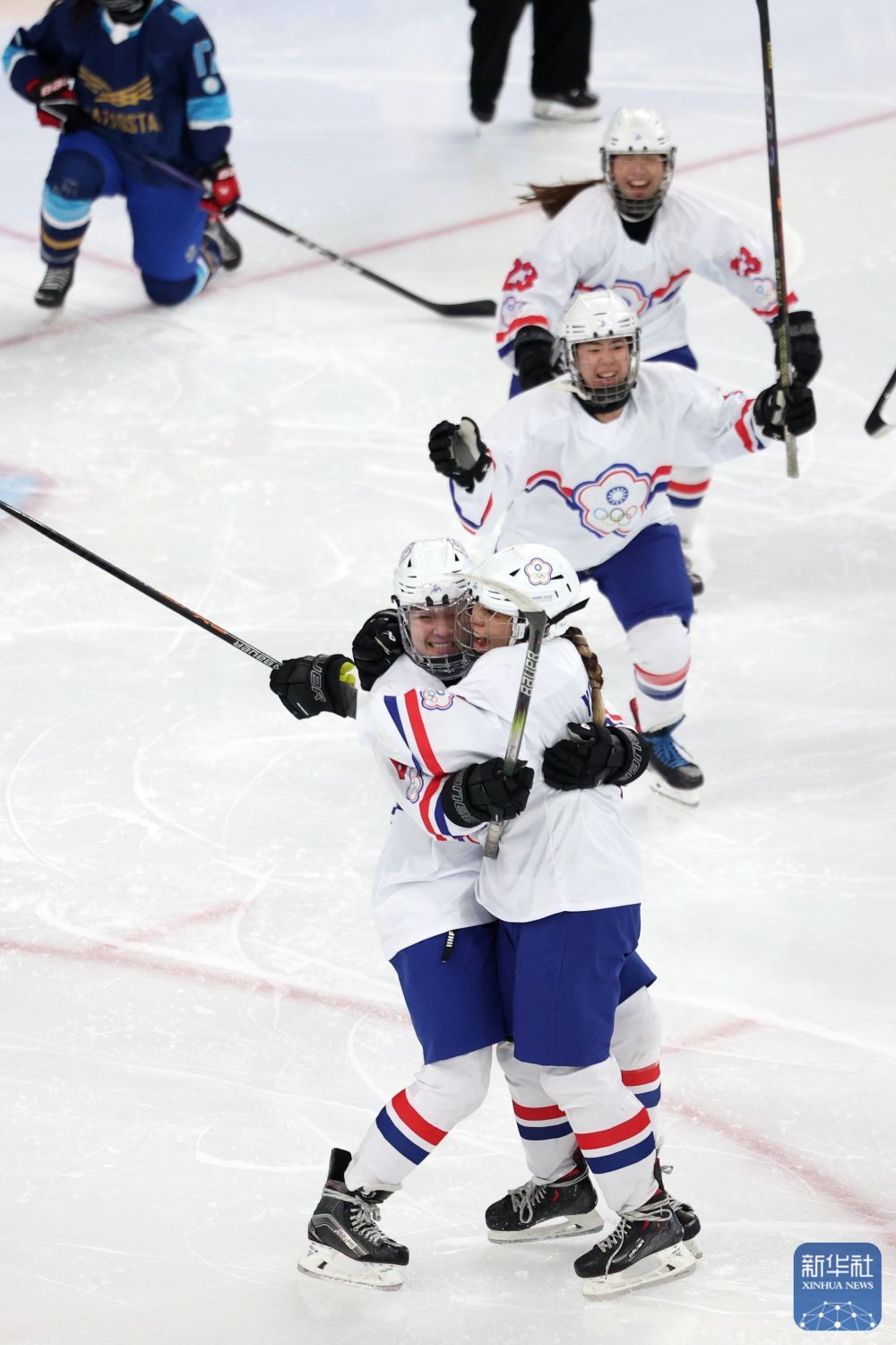 ↑2月6日,中国台北队球员吴季慈(左一)在比赛中庆祝进球。