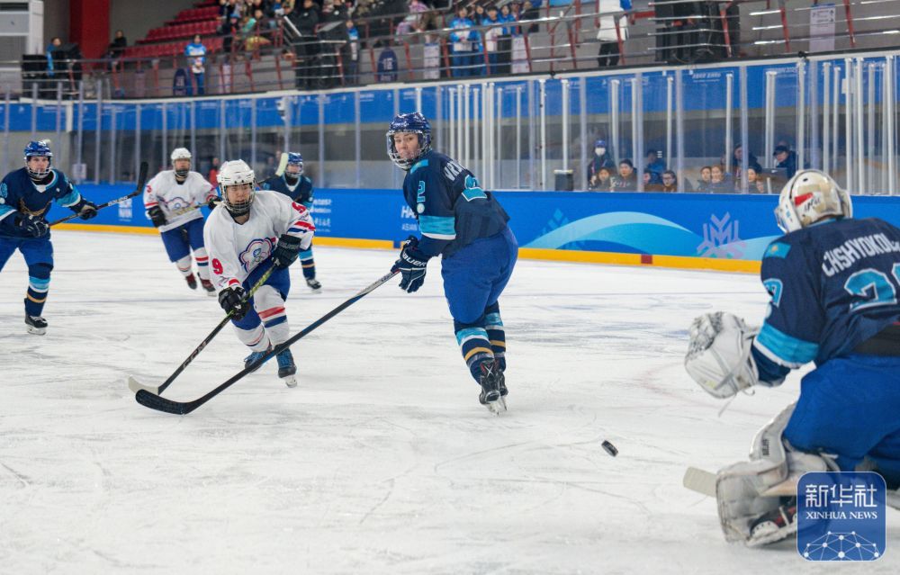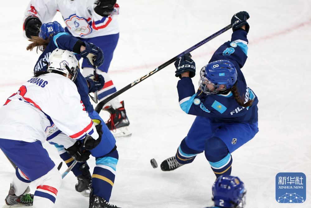 ↑2月6日,哈萨克斯坦队球员玛莉卡·阿尔达别尔格诺娃(左)在比赛中射门。