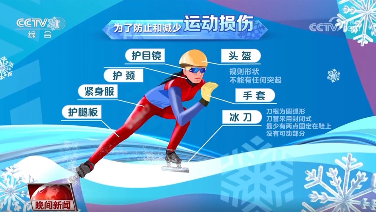 为了防止和减少运动损伤,运动员头盔必须是规则形状,不能有任何突起,还可以选择佩戴护目镜,护颈、手套、紧身服、护腿板都要有防切割功能,冰刀刀根为圆弧形,刀管采用封闭式,最少有两点固定在鞋上,没有可动部分。