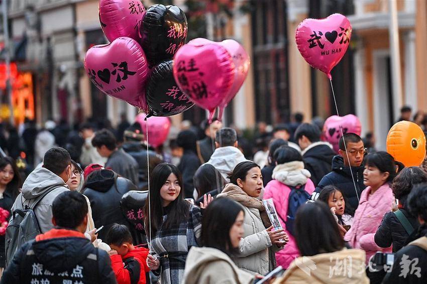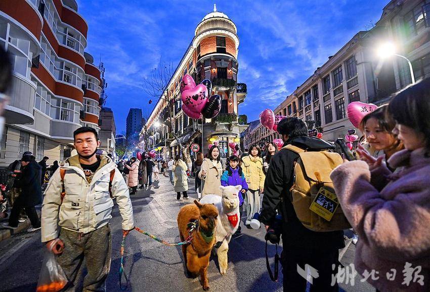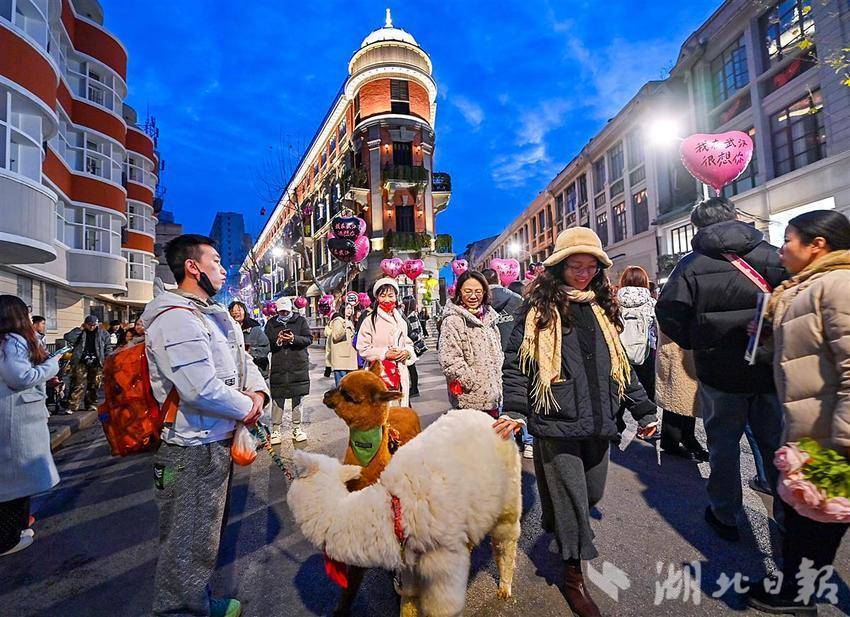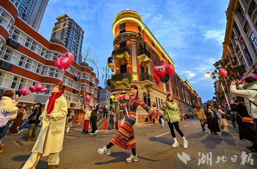 2月6日晚,位于武汉汉口历史风貌区的江汉路、中山大道、黎黄陂路、巴公房子热闹非凡,尤其是巴公房子,这座历史悠久的建筑吸引了众多游客。拿着气球、捧着鲜花的游客在此留下一张张倩影。