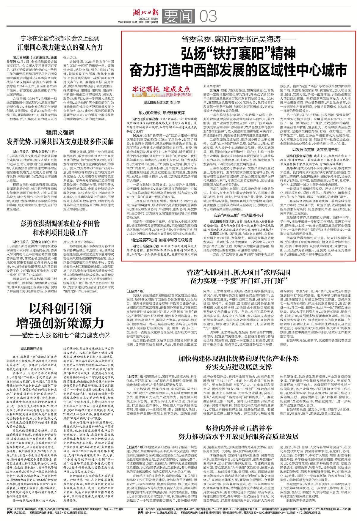 吴海涛:建成支点时不我待、事在人为,敢打敢拼才会赢。我们将传承和发扬“铁打襄阳”坚韧顽强、奋发向上的精神,强化拼抢意识,激扬争先斗志,当好执行者、行动派、实干家,做到高效率、快节奏、扎实干、有作为,以襄阳一域之为服务全省支点建设。