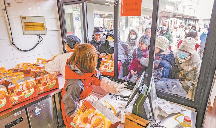 市民围在五芳斋的窗口前购买叠式汤圆 摄影:楚天都市报极目新闻记者李辉