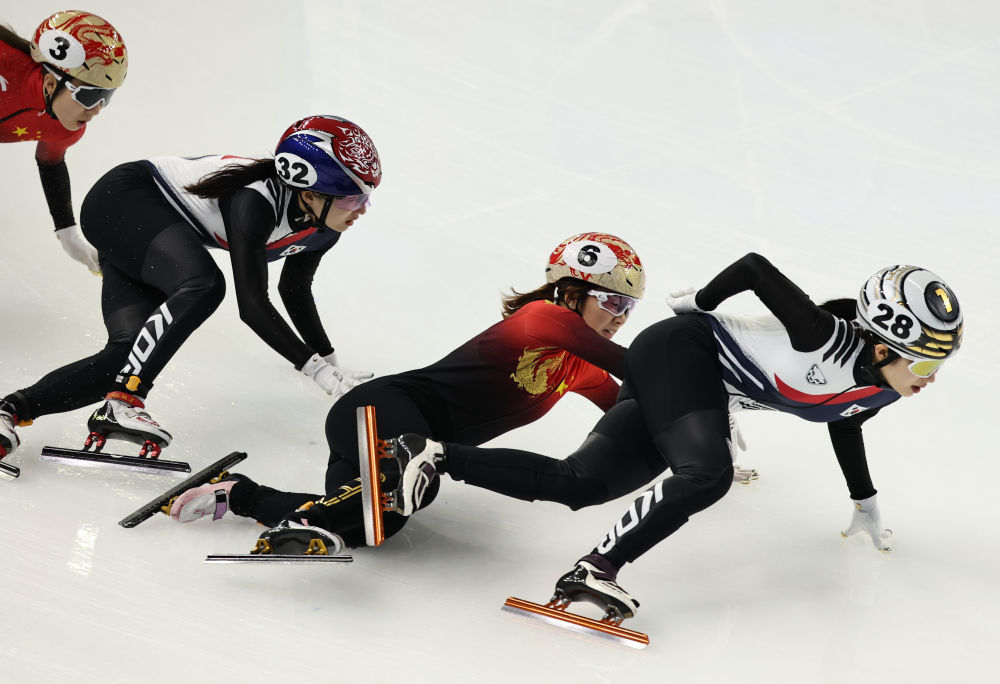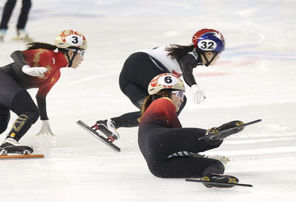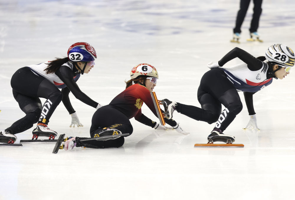 ↑ 中国选手杨婧茹(右二)在比赛中摔倒。新华社记者 郑焕松 摄