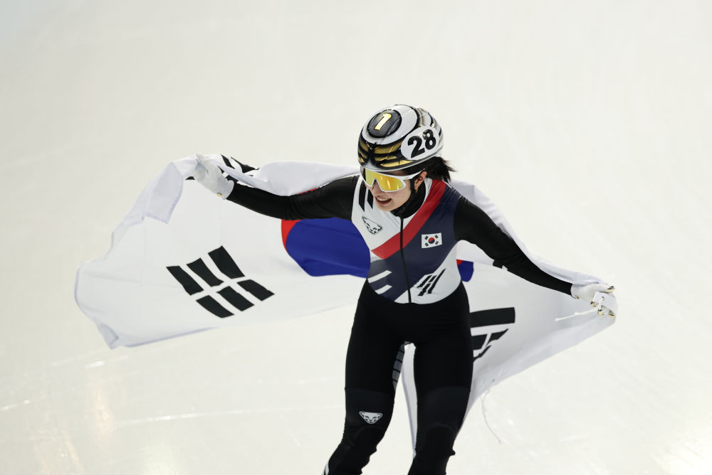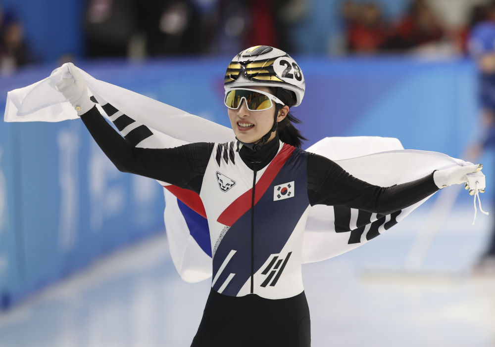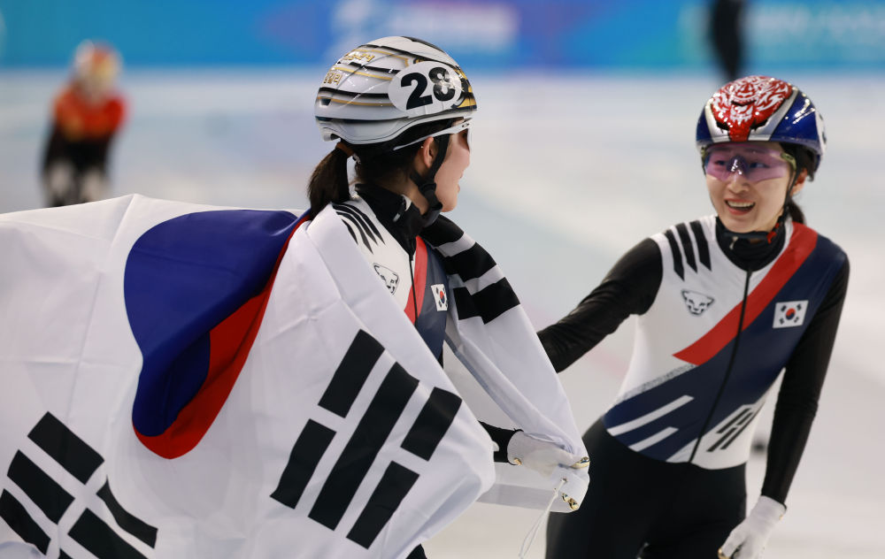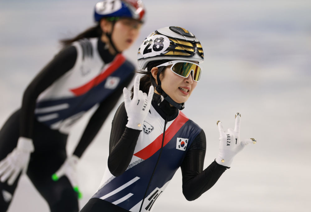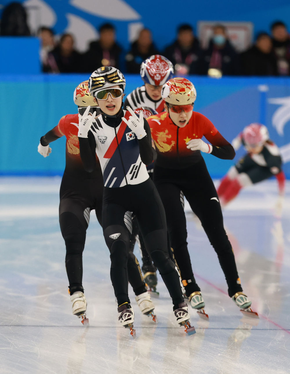 ↑ 韩国选手金吉莉(前)率先冲过终点后庆祝。新华社记者 许雅楠 摄