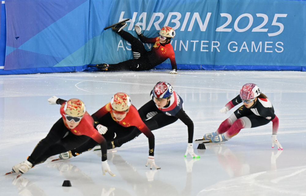 ↑ 中国选手杨婧茹(前)在比赛中摔倒。新华社记者 张涛 摄