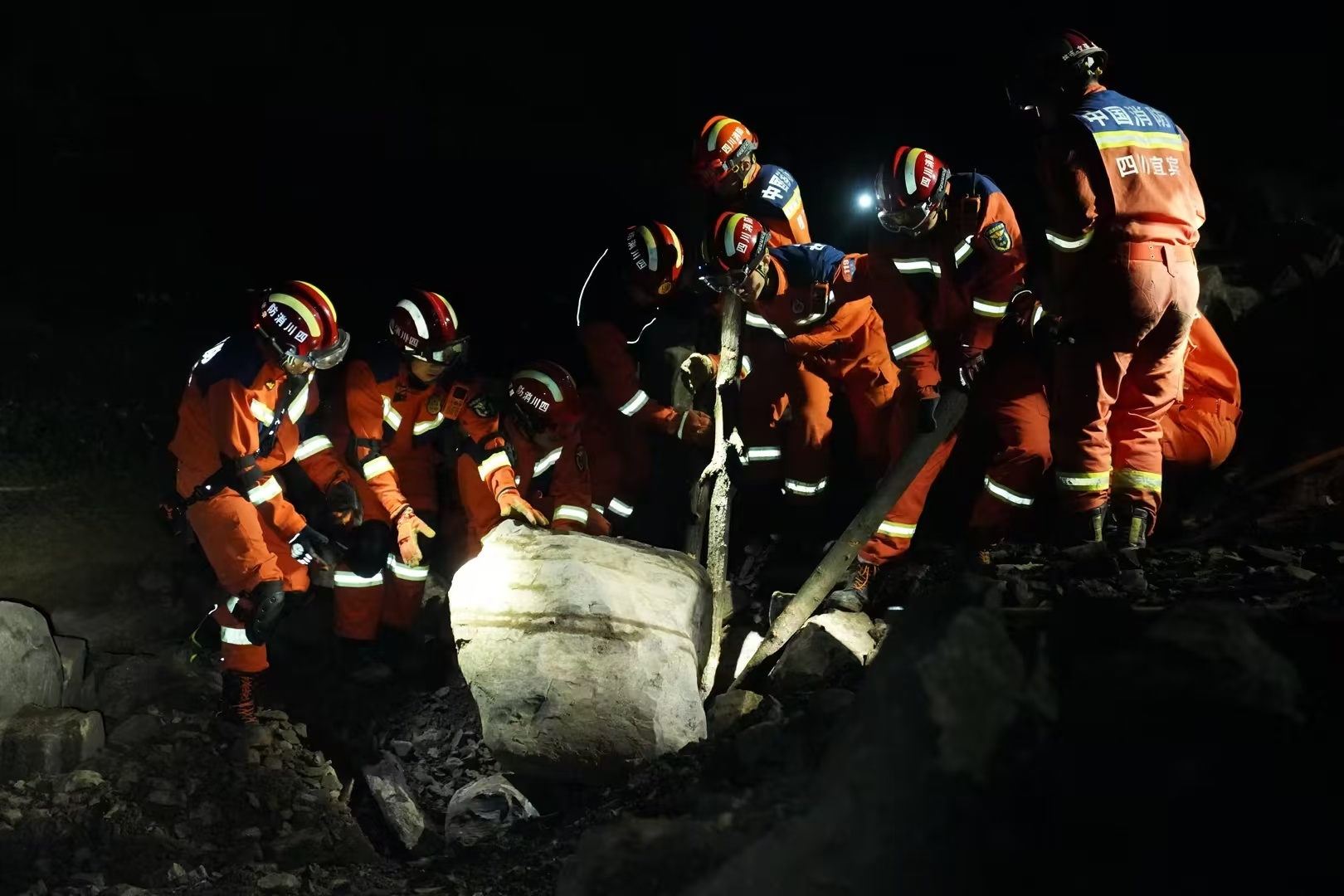 2月8日,四川宜宾筠连县突发山体滑坡。图为2月8日夜,消防救援人员利用搜救犬、生命探测仪从下至上对垮塌废墟进行搜索,对关键点位进行标注后,对废墟现场进行浅表搜救。