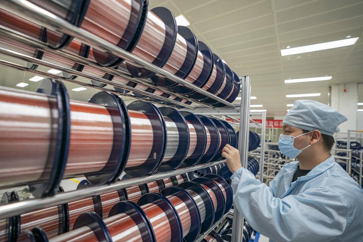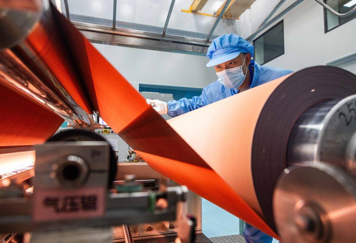 2月4日,湖北诺德锂电铜箔产业园,一台台生箔一体机高效运转,员工加紧赶制订单。该公司预计一季度完成产能1.2万吨,全年总产值实现翻番。 (湖北日报全媒记者 薛婷 通讯员 周巍 张春玲 摄)